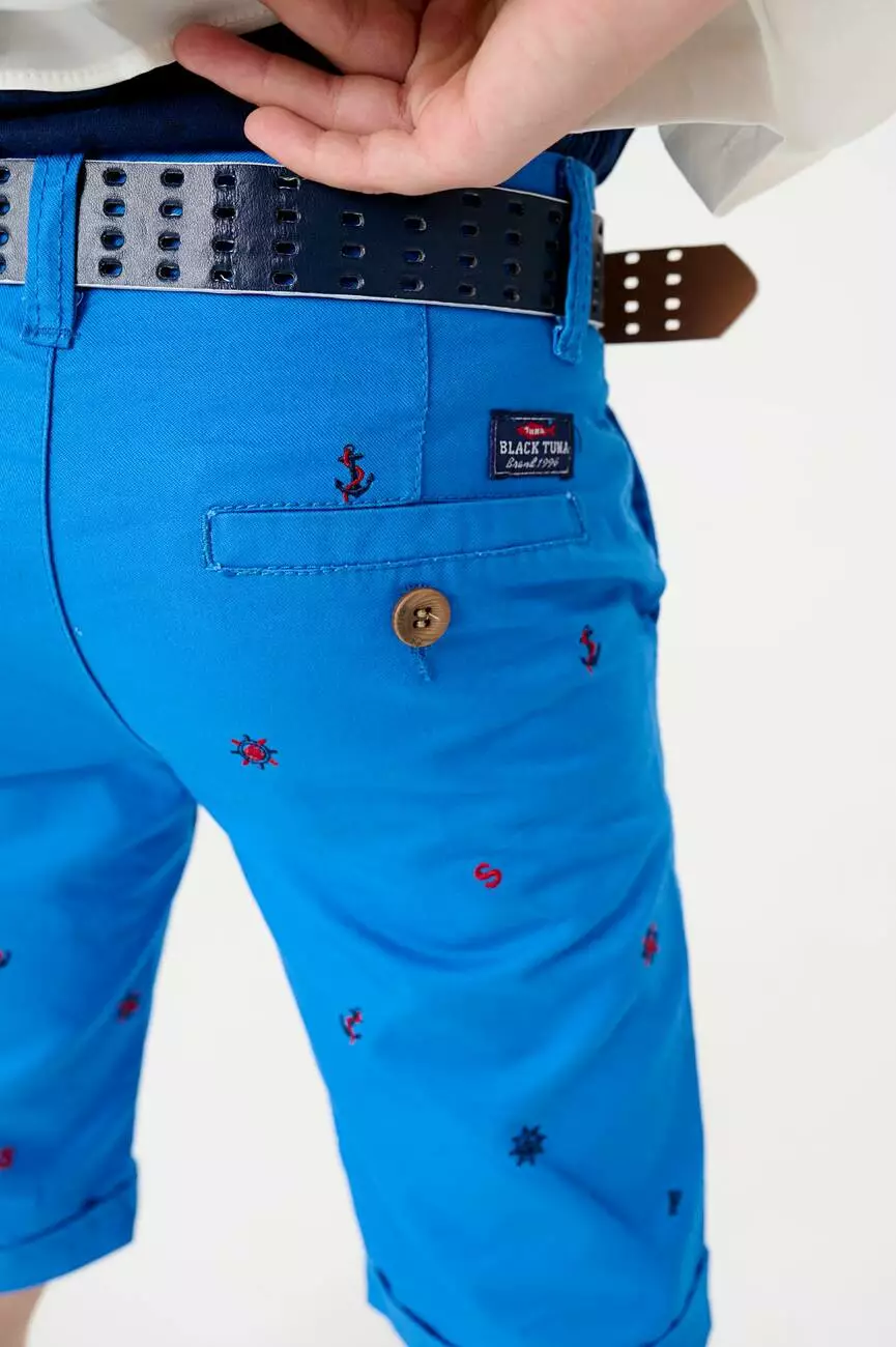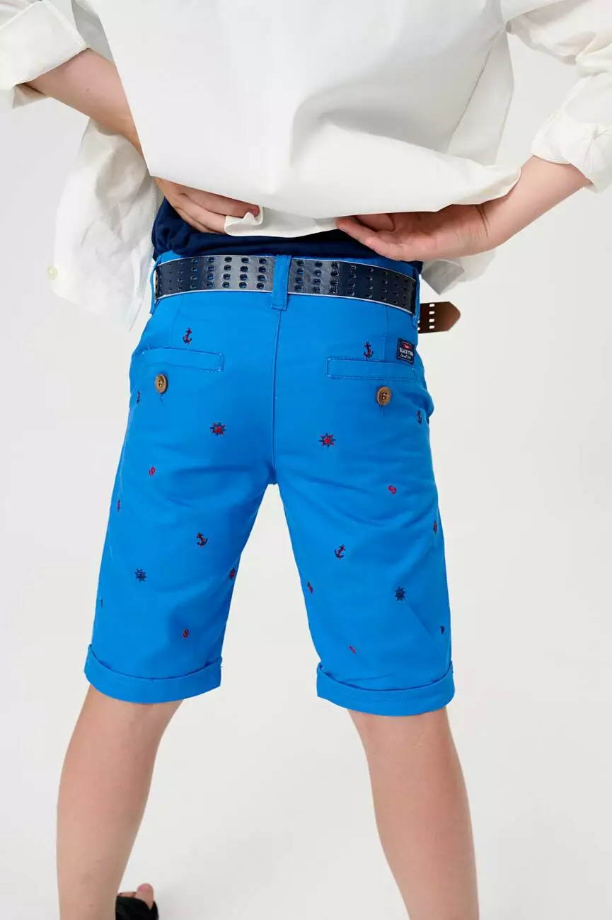 Деталі моделі: однотонні шорти, синього кольору. Середня висота по лінії талії. Застібка – на блискавці. Спереду та ззаду є кишені. Низ брючин з підворотом. За бажанням, шорти можна носити з ремінцем. Довжина виробу – до коліна. Сезон: весна-літо. Матеріал виробу: бавовна.