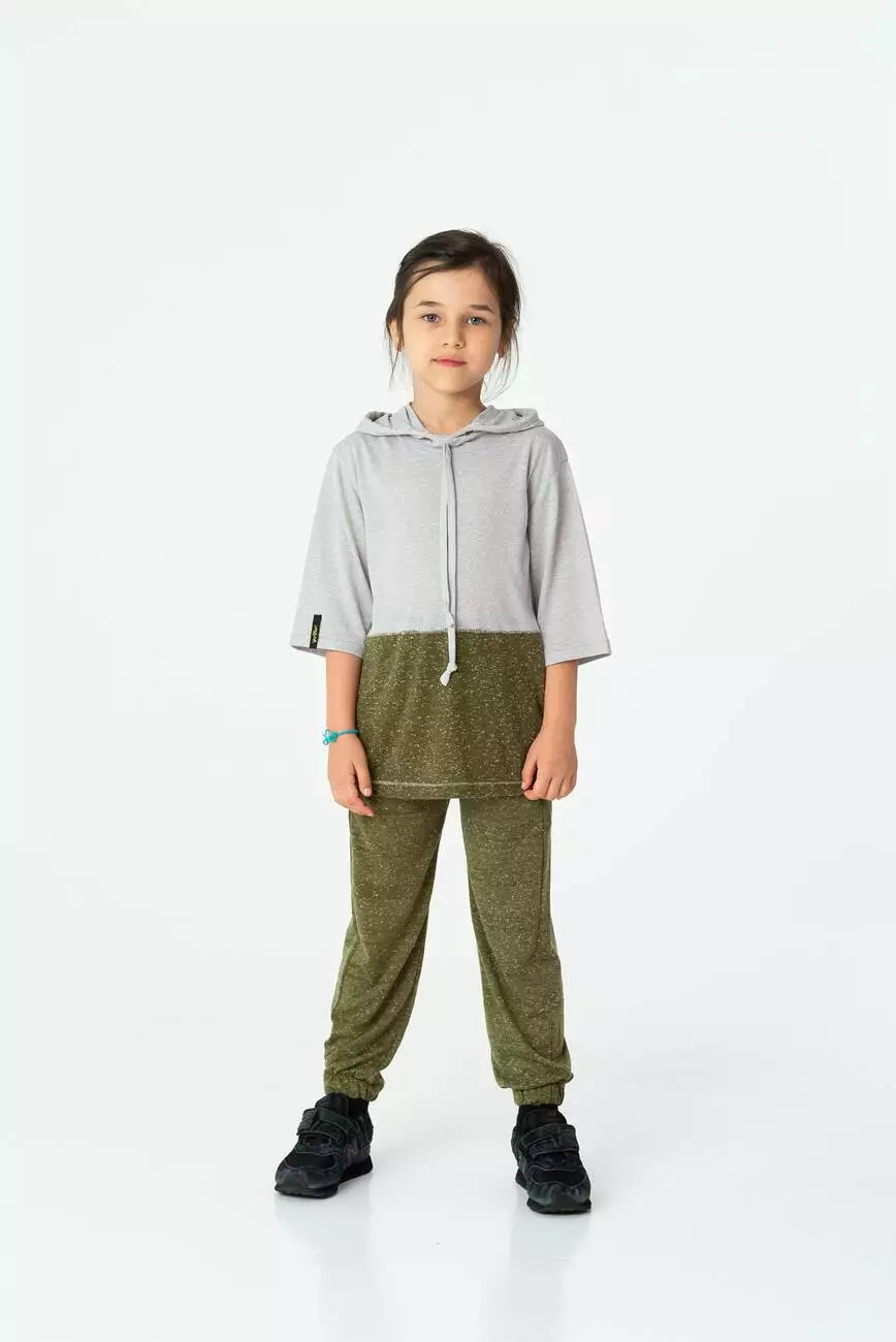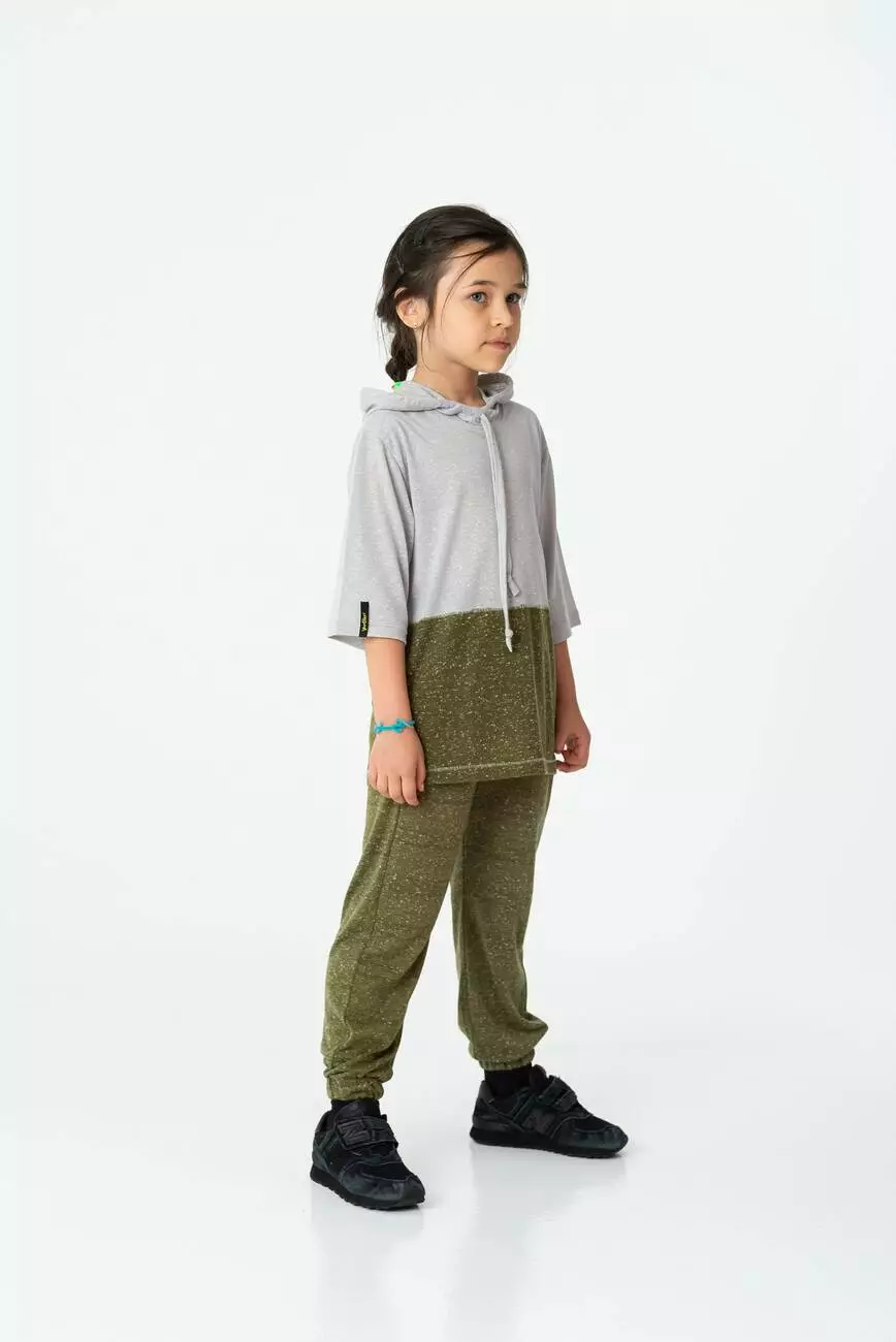 Деталі моделі: Основний колір - хакі (зелений). Штани напівприлягаючого силуету зі зміщеними бічними швами. Є дві бічні кишені. У поясі і по низу брюк вставлена резинка. Без декору.
