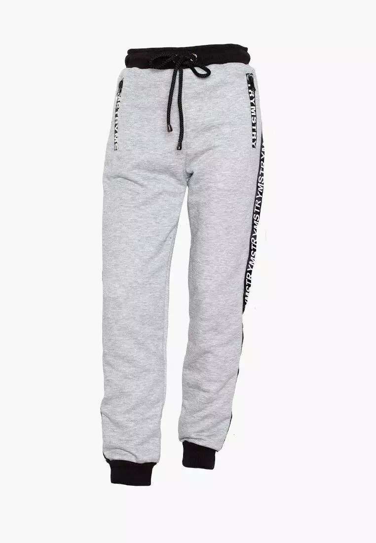 Круті сірі штани з резинкою внизу.