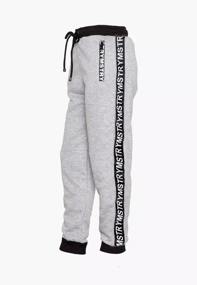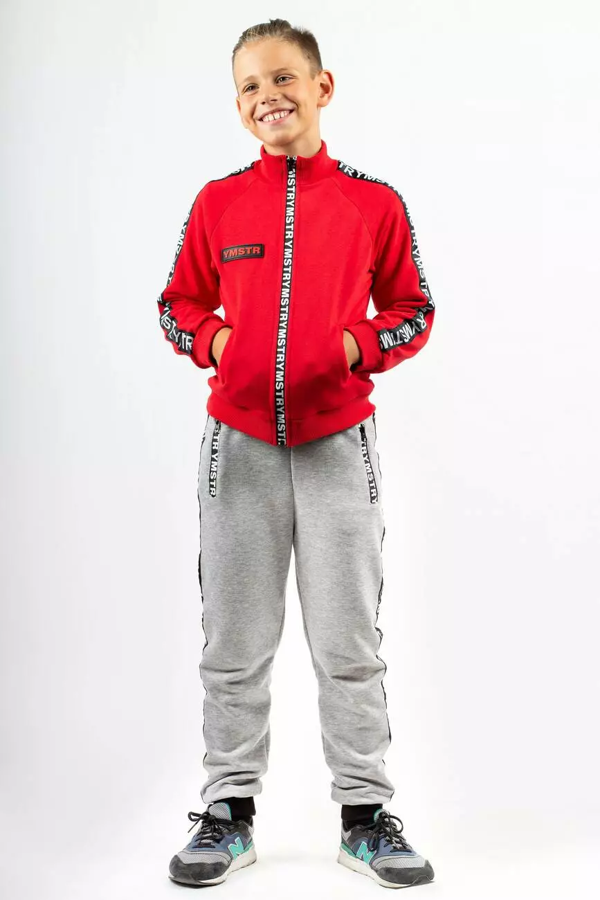 Деталі: штани сірого кольору. Брендована блискавка на бічних кишенях. Брендовані лампаси. Пояс виконаний з міцної рибани. Зав'язка на шнурку. Матеріал - тринитка.