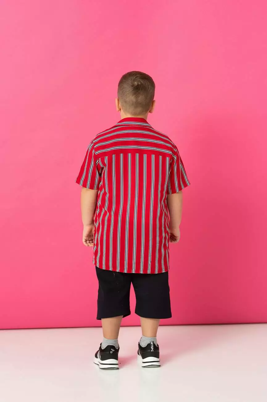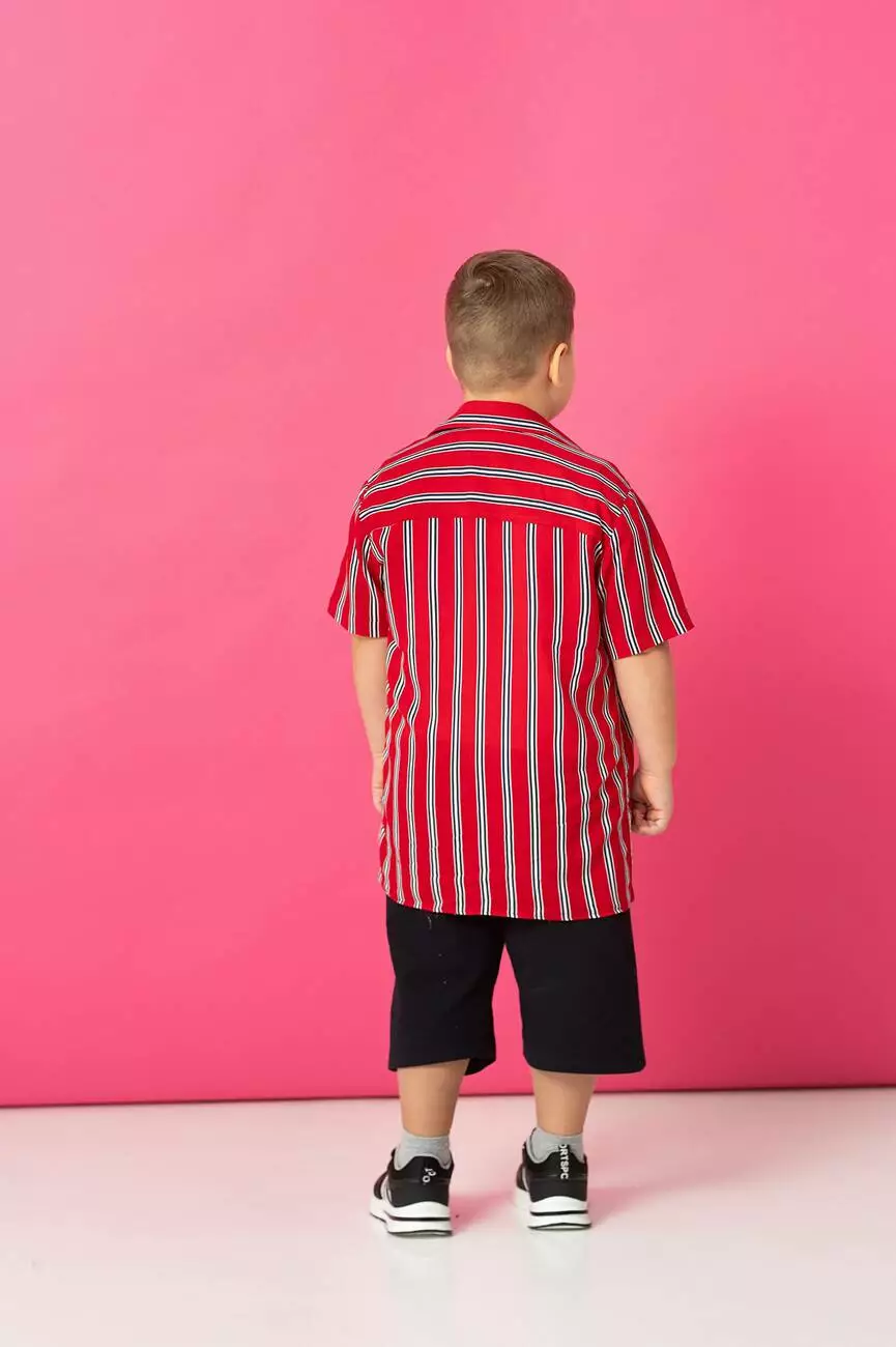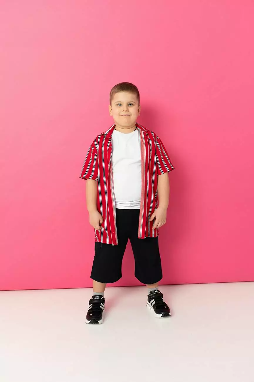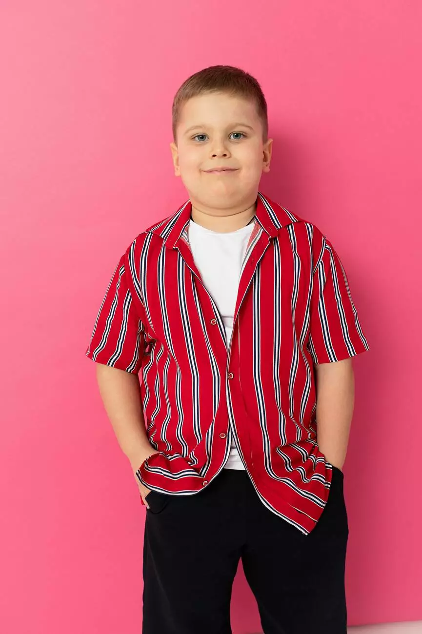 Деталі моделі: основний колір сорочки – червоний. Візерунок - вертикальна тонка смужка білого кольору. Короткий рукав. Відкладний комір. Сорочка прямого крою. Сезон – весна-літо. Матеріал – віскоза.