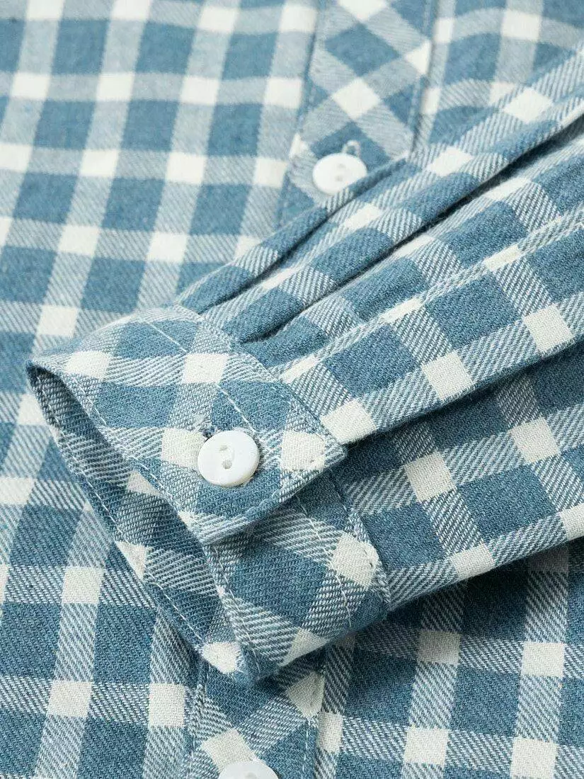Деталі моделі: сорочка у дрібну клітку. Основний колір бірюзовий. Довгий рукав. Відкладний комір. Прямий крій. Спереду застібається на гудзики. На грудях маленька вишивка.