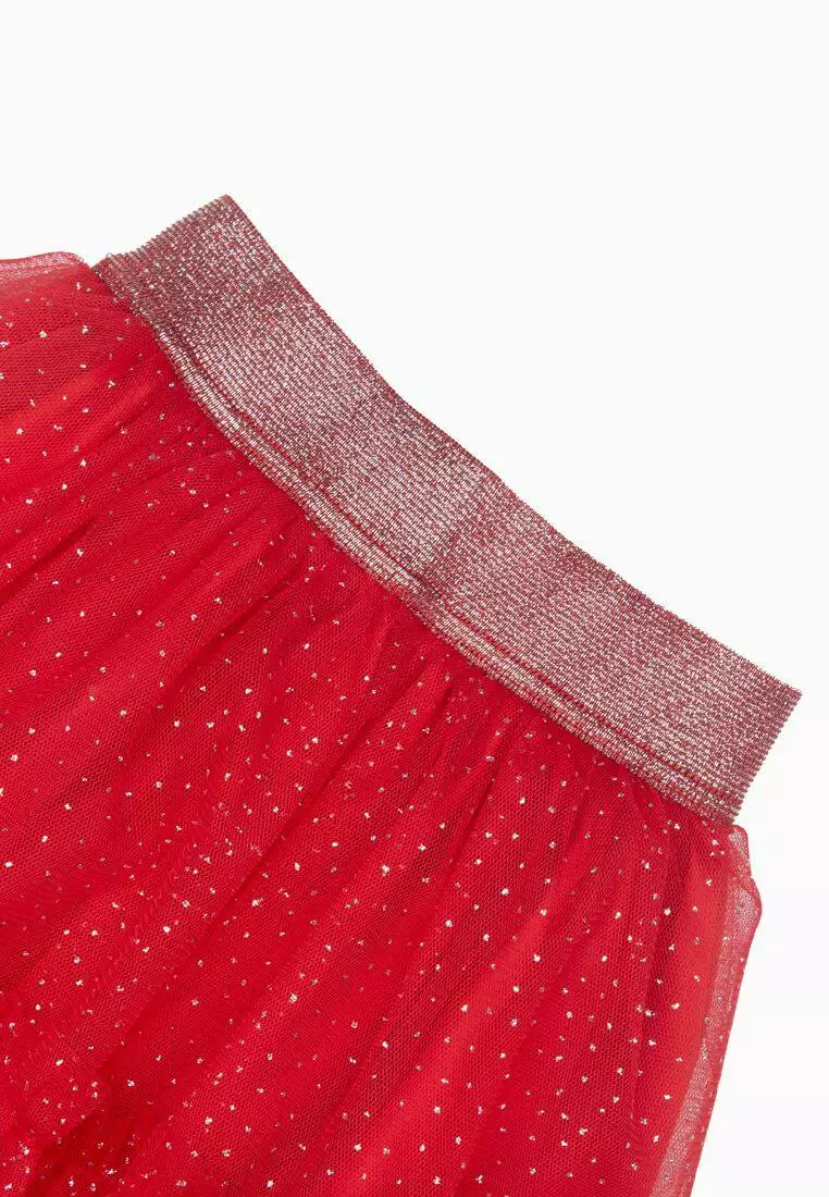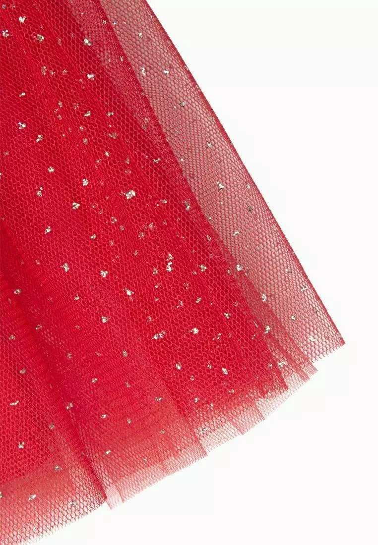 КАПСУЛА NEW YEAR 2022Деталі моделі: Спідниця червоного кольору. Нижня спідниця з непрозорої тканини. Верхній шар (евросітка) складається з двох рюшів, настрочених один на одного. Сріблясте напилення. Пояс виконаний із широкої резинки з люрексом. Довжина спідниці - вище колін.
