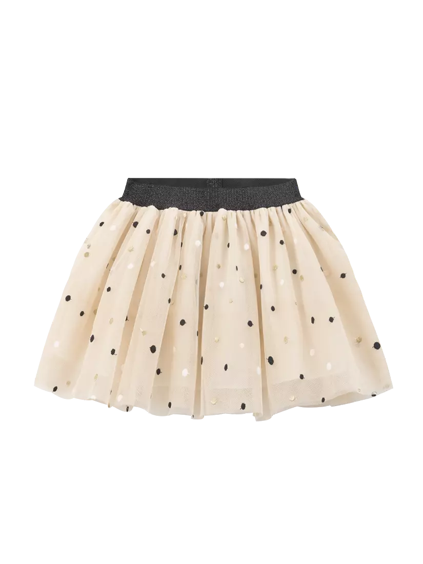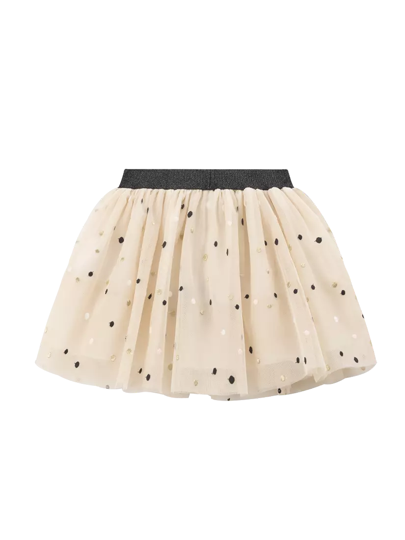 Зустрічайте нову колекцію - колаборація брендів YUMSTER і NEWNESS! Хто не любить пишні спідниці? Здається, таких дівчат не буває. А якщо такі є – вони просто ще не бачили цієї спідниці! Деталі моделі: спідниця світло-бежевого кольору. Пояс на резинці, чорного кольору з глітером. Довжина спідниці до колін. Є білий, непрозорий під’юбник. Верхній шар спідниці декорований дрібним горохом. Розмірний ряд: на зріст від 98 см до 140 смСклад: 100% поліестер.