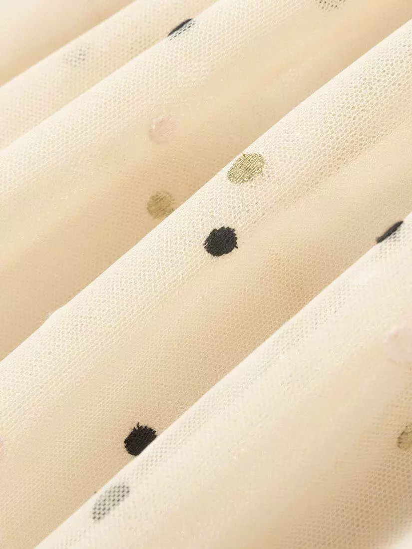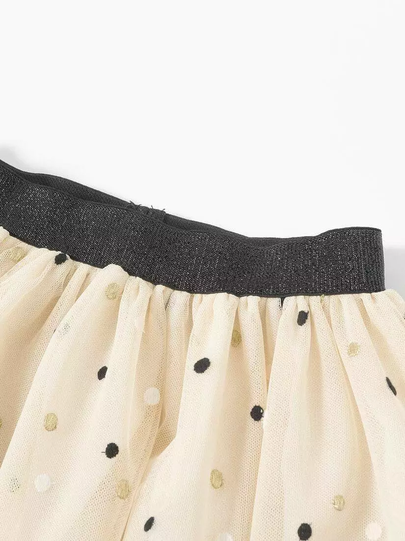 Деталі моделі: спідниця світло-бежевого кольору. Пояс на резинці, чорного кольору з глітером. Довжина спідниці до колін. Є білий, непрозорий під’юбник. Верхній шар спідниці декорований дрібним горохом.