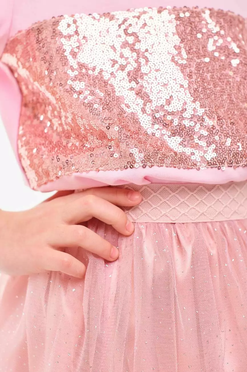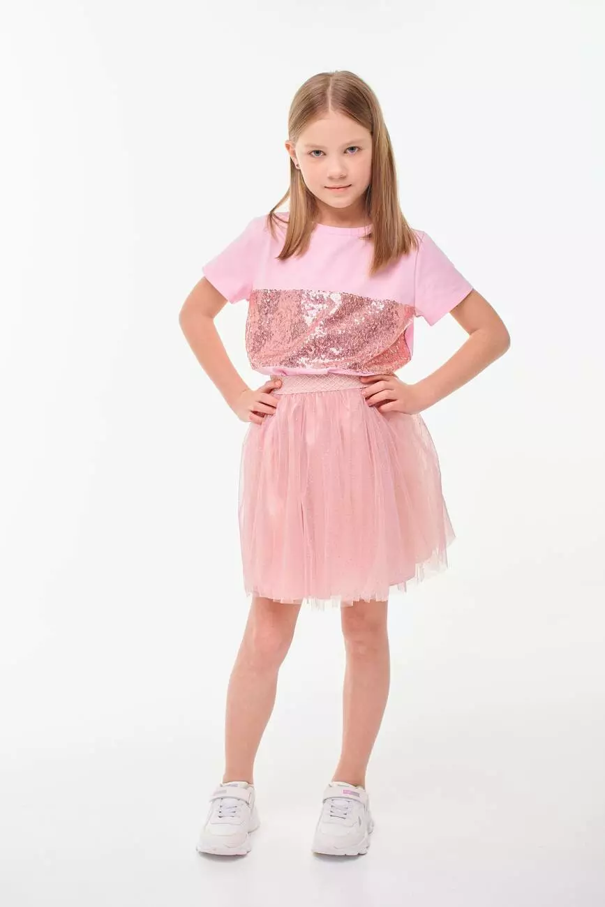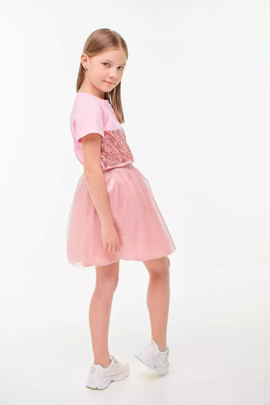 Деталі моделі: Спідниця пудрового (рожевого) кольору. Довжина спідниці - до колін. Підкладка - атлас. Верх спідниці - 2 шари фатину. Верхній шар фатину з срібним напиленням. Пояс виконаний із широкої резинки в тон спідниці.Склад: віскоза 70%, поліестер 30%