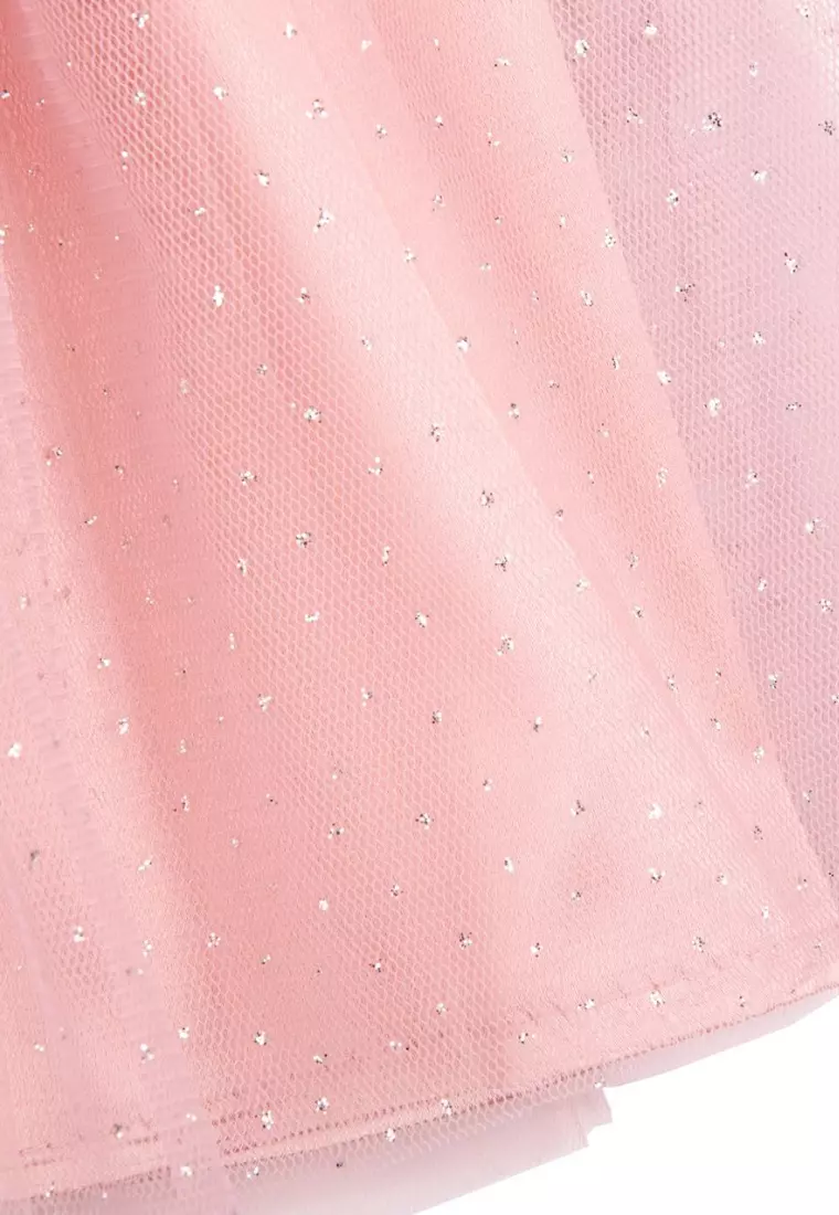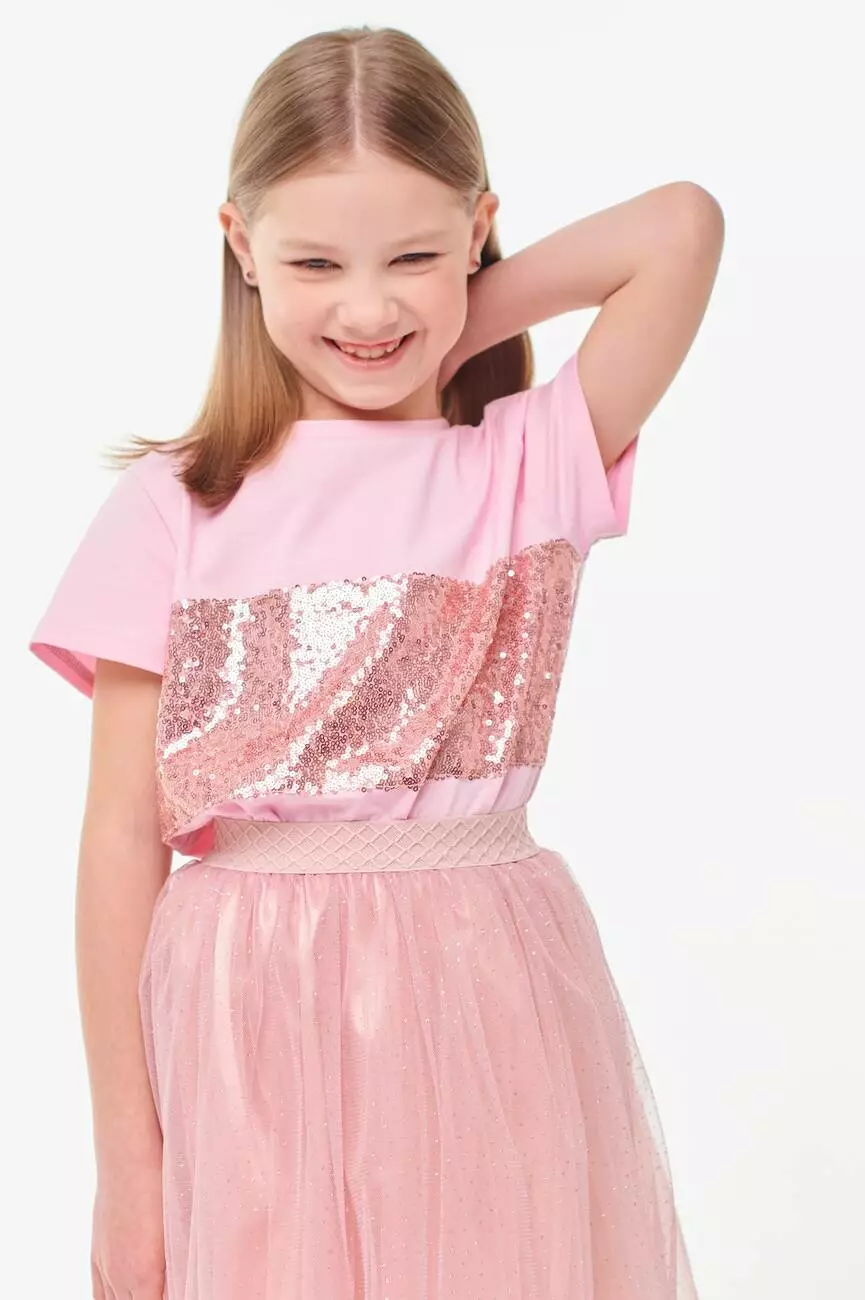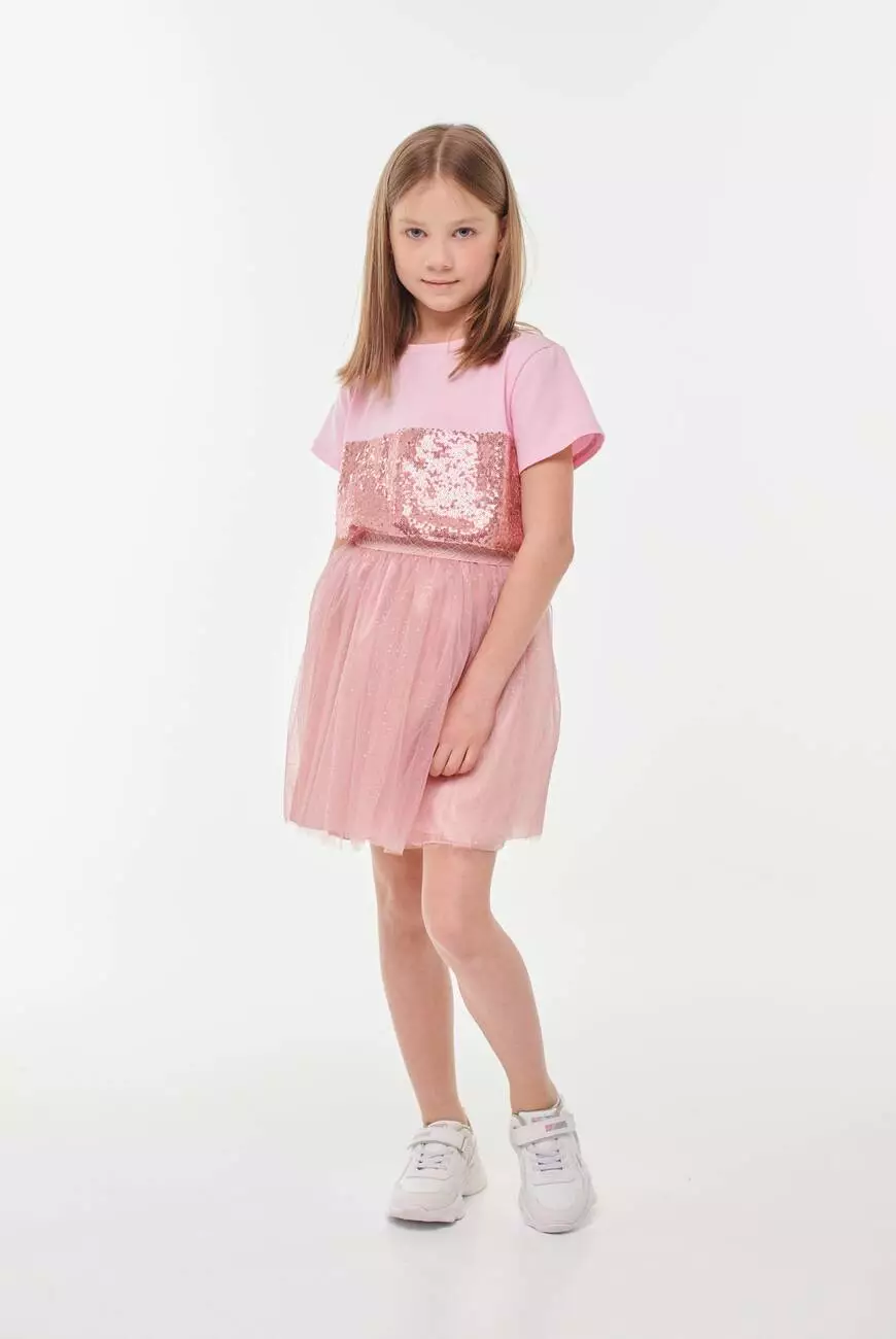 Деталі моделі: Спідниця пудрового (рожевого) кольору. Довжина спідниці - до колін. Підкладка - атлас. Верх спідниці - 2 шари фатину. Верхній шар фатину з срібним напиленням. Пояс виконаний із широкої резинки в тон спідниці.Склад: віскоза 70%, поліестер 30%