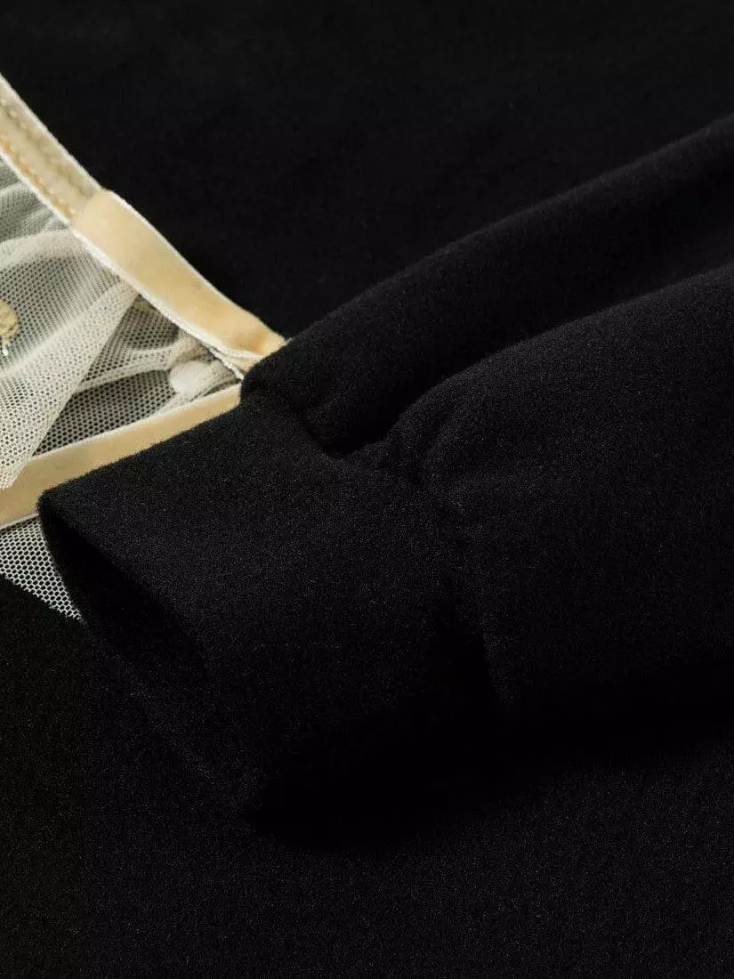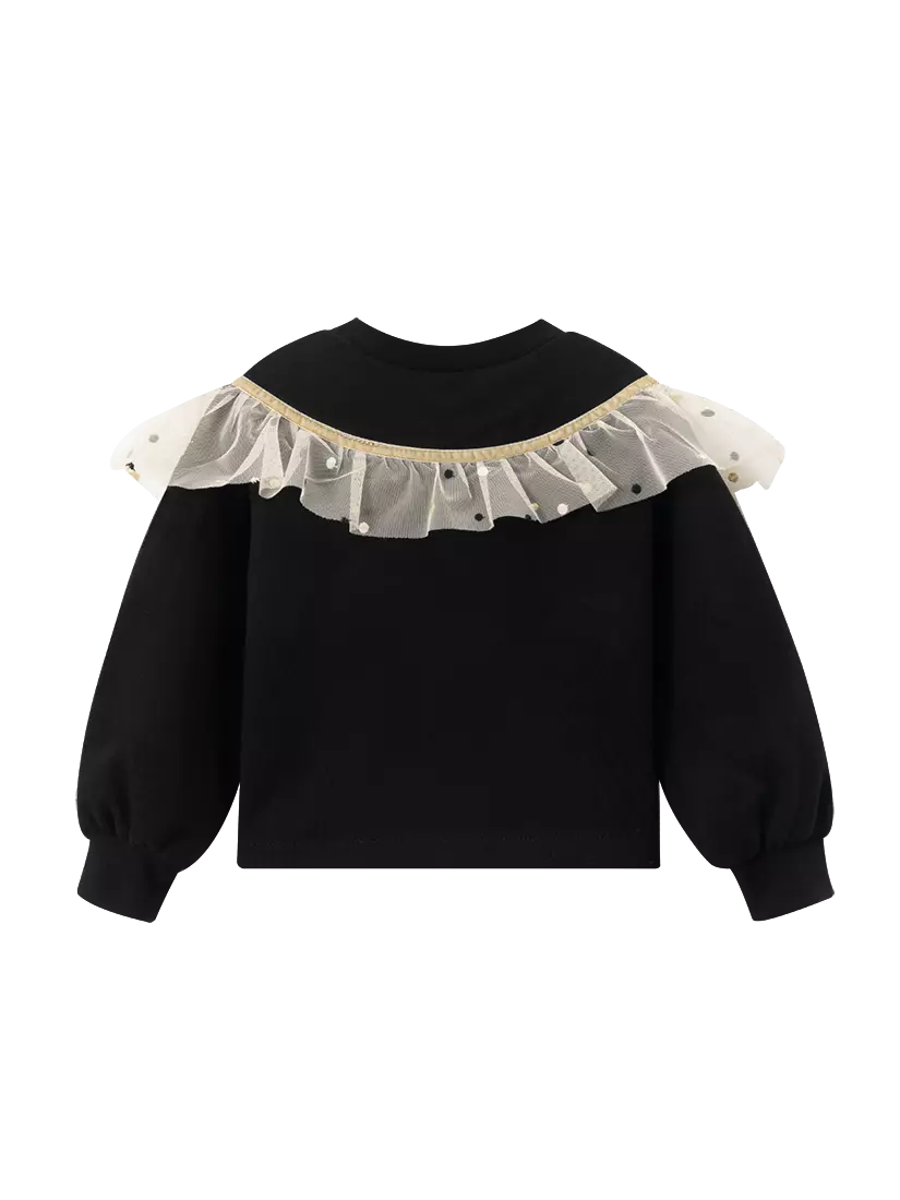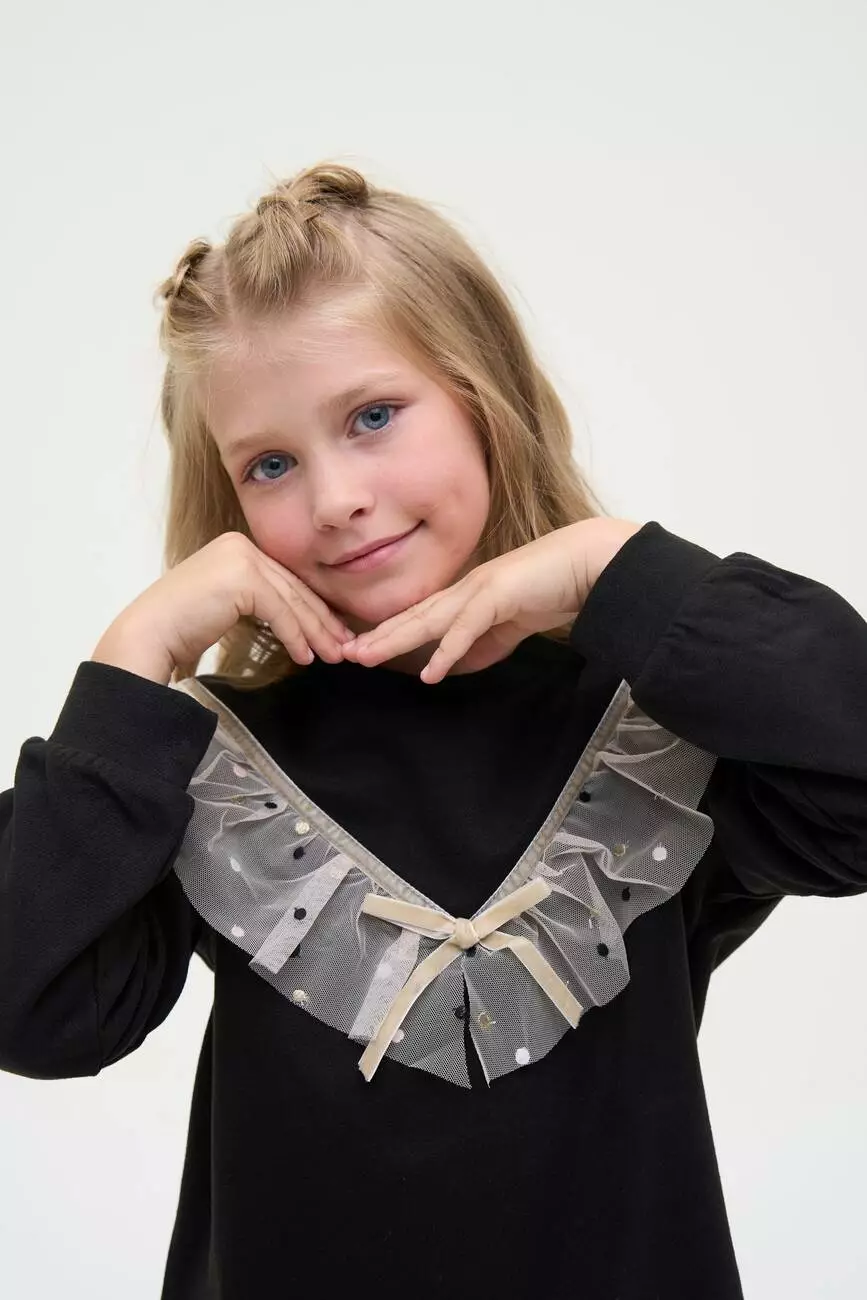 Зустрічайте нову колекцію - колаборація брендів YUMSTER і NEWNESS! Наочний приклад, як одна невелика деталь може змінити здавалося б, звичайнісінький предмет повсякденного гардеробу. Зустрічайте – незвичайний світшот із вставкою з фатину. Додайте до нього пишну спідницю та вуаля! Святковий образ готовий. Деталі моделі: світшот чорного кольору. Кругла горловина. Довгий рукав. По верхній частині світшота проходить рюш із фатину, V-подібної форми та декоративною зав'язкою зі стрічки. Розмірний ряд: на зріст від 98 см до 140 смСклад: 100% поліестер.