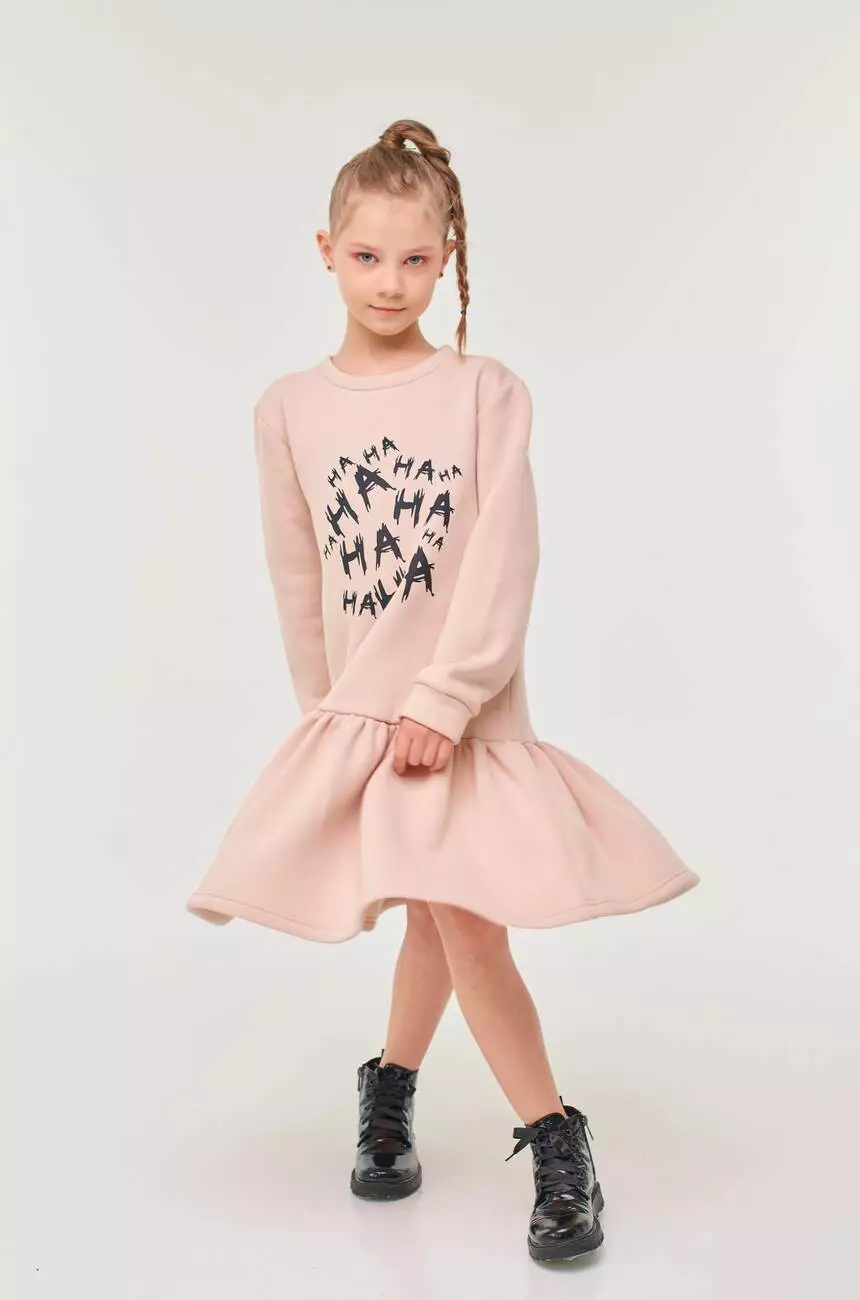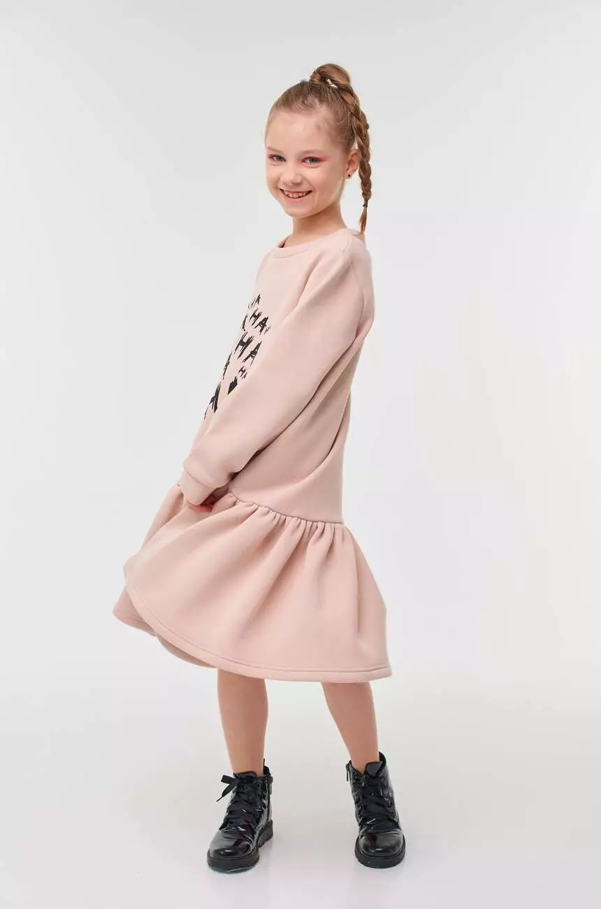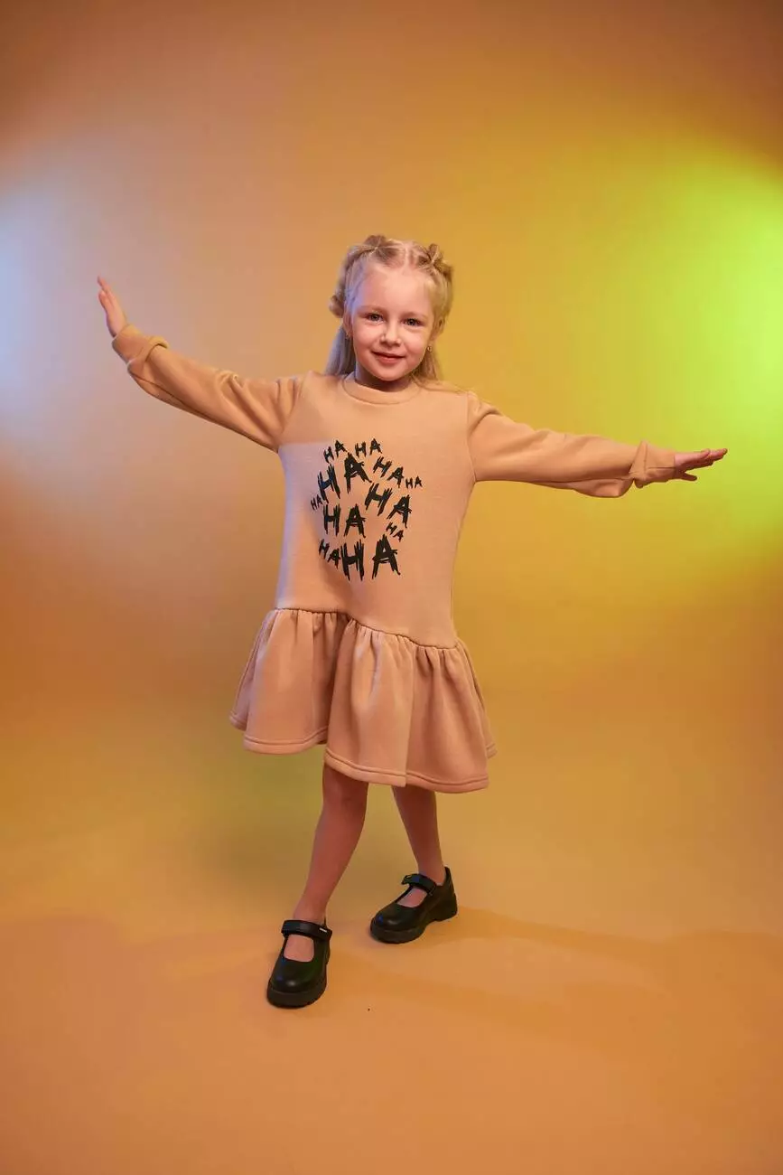 Тепла сукня для дівчинки. Практичний варіант на холодну пору. Розмірний ряд: на зріст від 110 см до 140 см. Деталі моделі: Колір сукні - бежевий. Вільний силует із заниженою лінією талії та зібраним рюшем по низу. Кругла горловина. Довгий рукав з манжетами. Занижена лінія плеча. На грудях чорний принт. Матеріал - трьохнитка з флісом.Склад: 90% бавовна, 10% еластанРекомендації по догляду: машинне прання при температурі 30 градусів. *Відтінок кольору на фотографії може відрізнятися від реального]]>