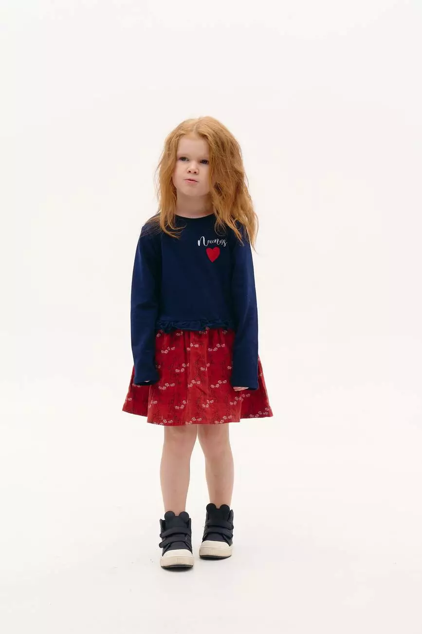 Деталі моделі: сукня контрастного кольору: синій верх і червоний низ. Без застібки. Кругла горловина. Довгий рукав. На грудях принт у вигляді серця. Лінія талії прикрашена дрібним рюшем. Спідниця з квітковим принтом. Довжина виробу – до колін. Чудово підходить на сезон весна-осінь. Матеріал – трикотаж.Розмірний ряд: на зріст від 98 см до 140 см