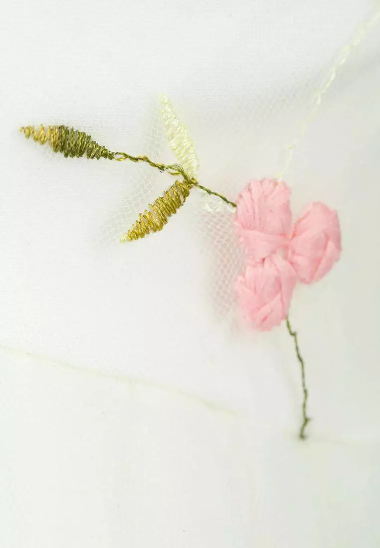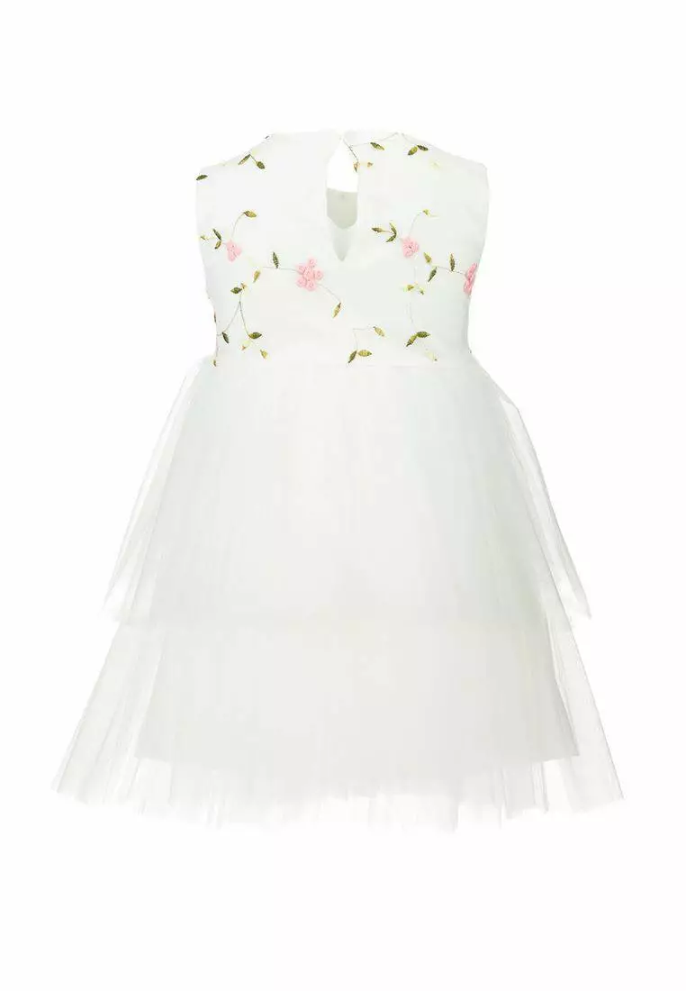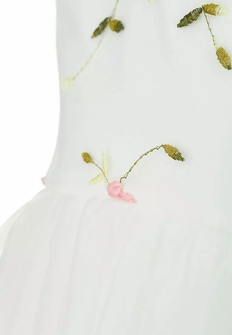 Деталі: Плаття молочного кольору. Два яруси фатину. Мереживо з вишивкою. Квітковий принт у верхній частині.
