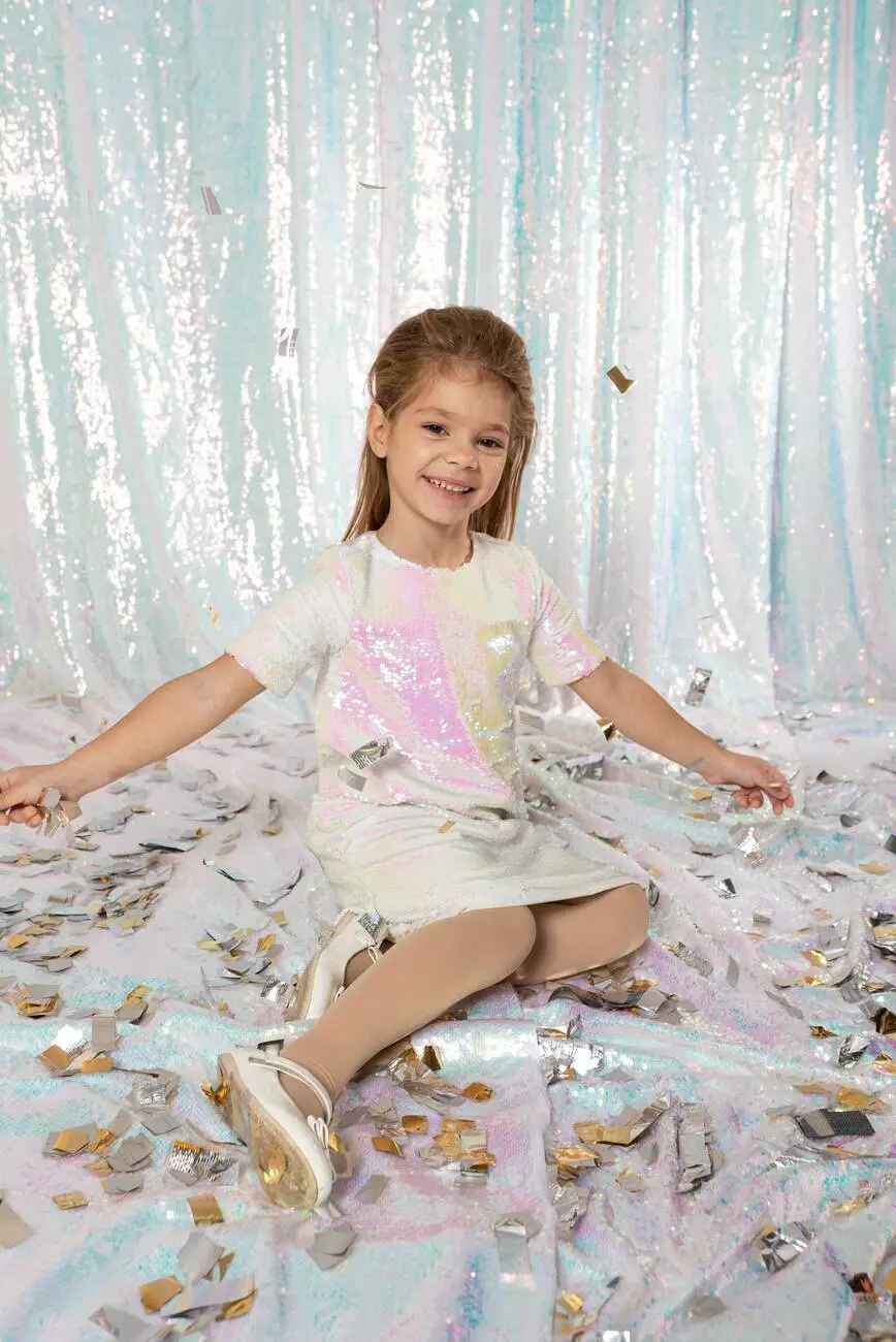Неймовірне плаття з біло-рожевими паєтками з коротким рукавом. Виконано із якісного матеріалу, який не линяє і не втрачає форму. В такому платті дівчинка відчує себе яскравою і неповторною.