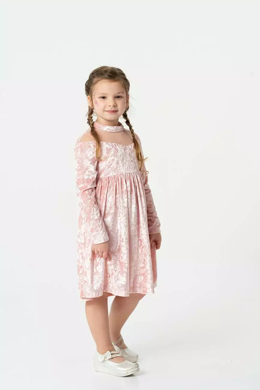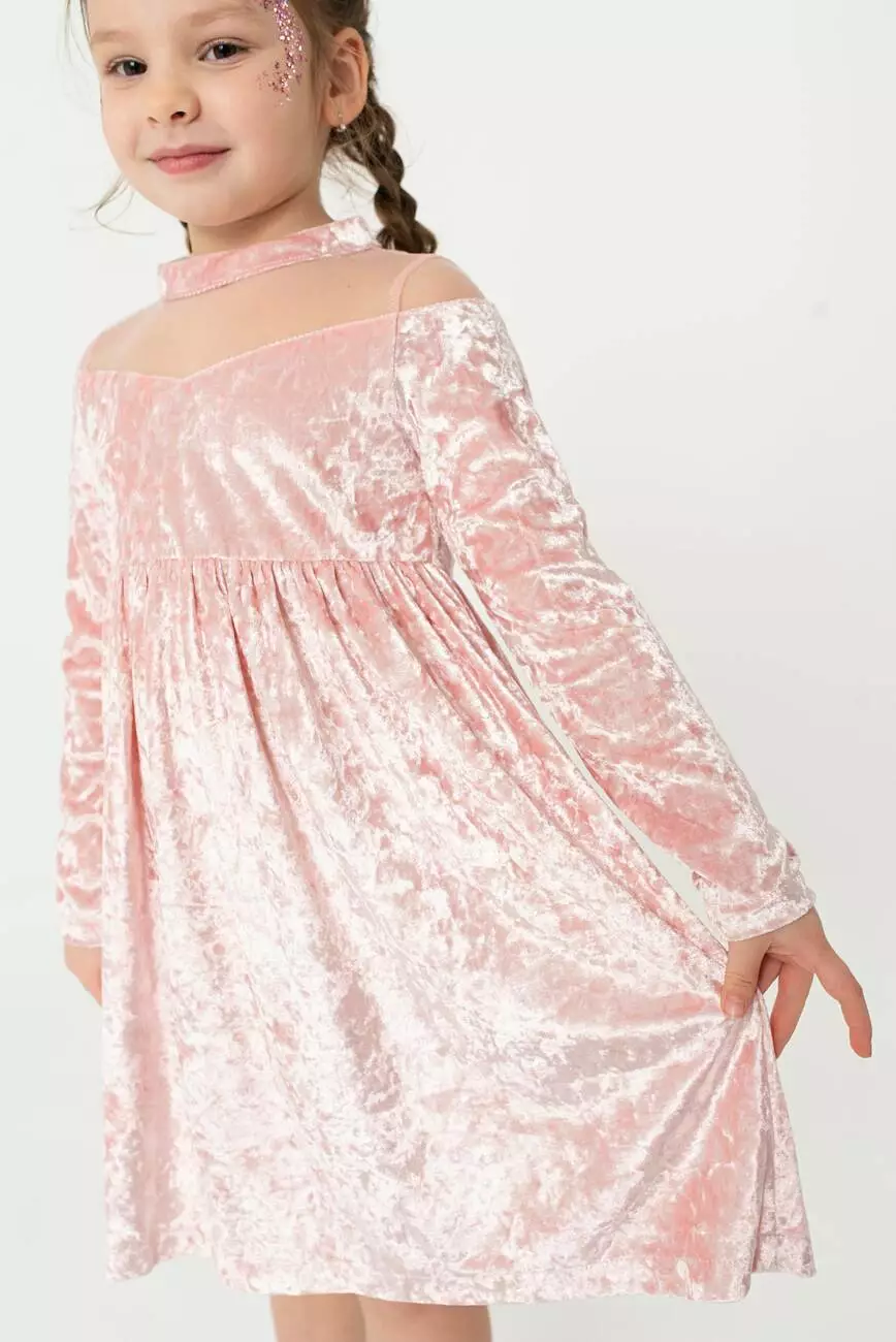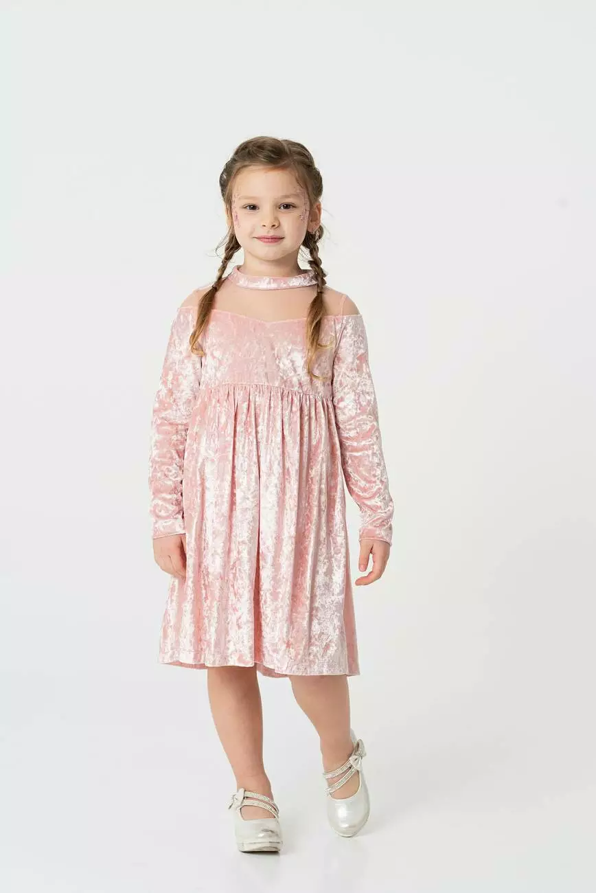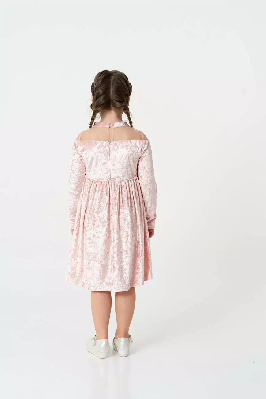 Деталі моделі: Колір - пудровий. Сукня з довгим рукавом із мармурового велюру. По переду та спинці ліфа розташовані кокетки з євросітки. Комір-стійка з велюру. Застібка - ззаду на гудзик. Ліф на підкладці з батиста (100% бавовна). Рукав прямий, трохи звужений до низу. По верхній частині рукава відрізна декоративна деталь - також з євросітки. Спідниця зібрана по лінії талії. Матеріал – велюр.Розмірний ряд: на зріст від 104 до 128 см.