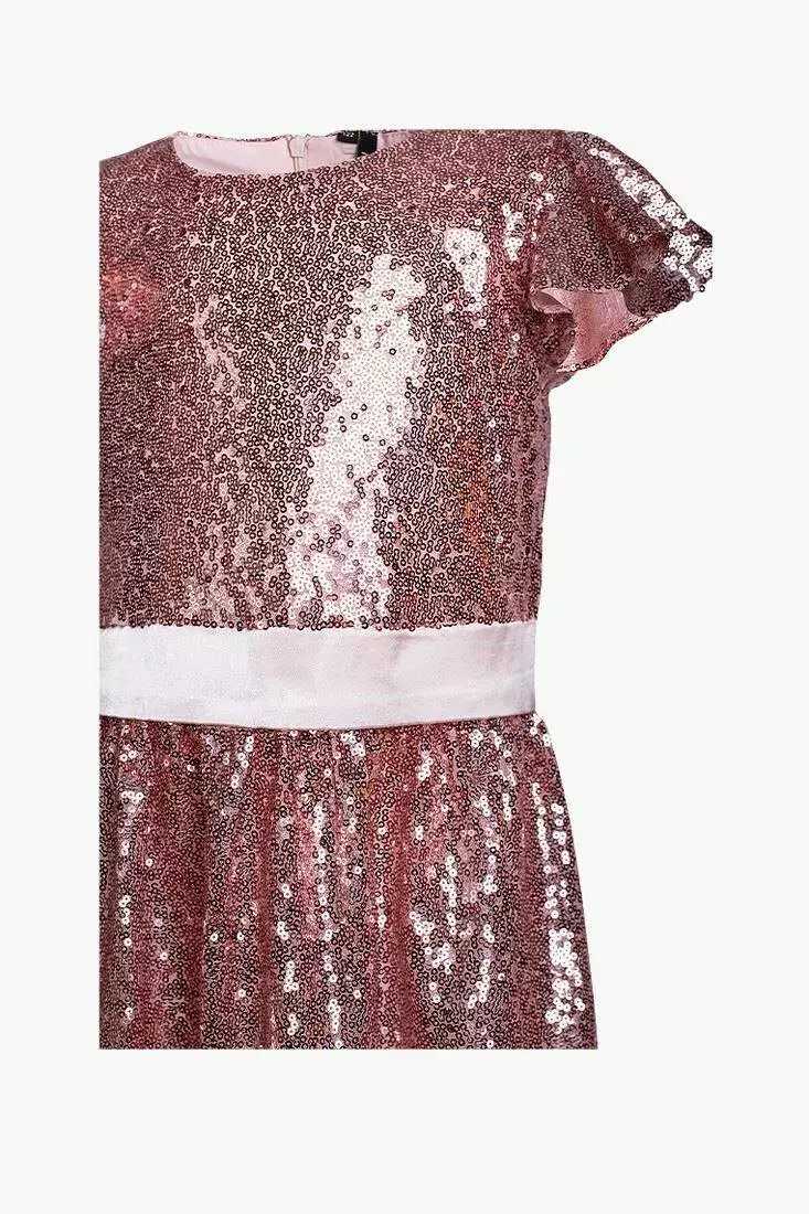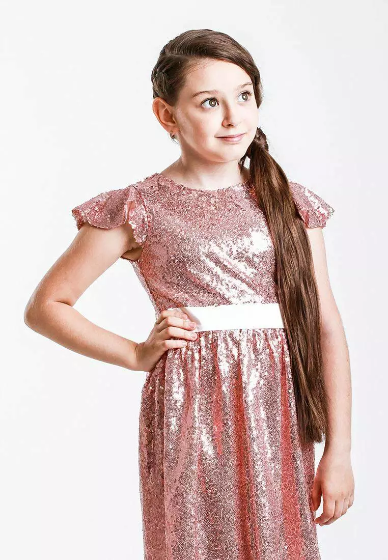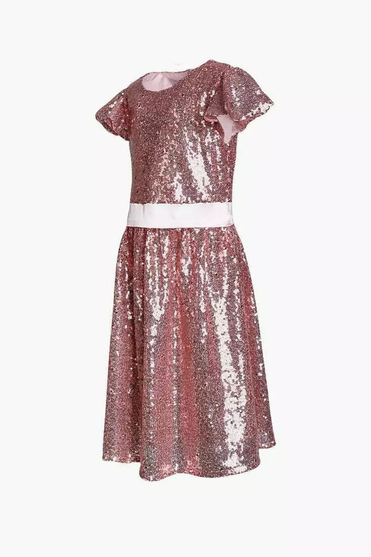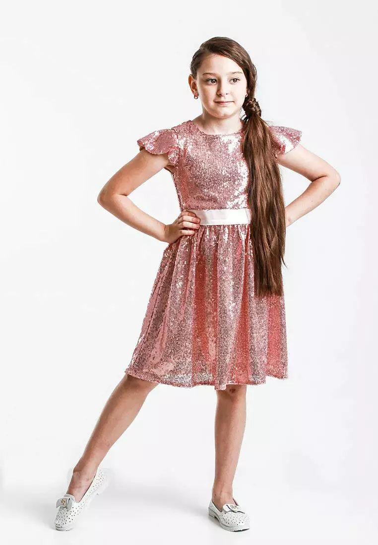 Деталі: Довжина сукні - середня. Основний колір плаття - рожевий (пудровий). Вся сукня в паєтках, яка має 2 відтінки. Білий атласний пояс. Кругла горловина, короткі рукава "крильця". Застібається ззаду на змійку.