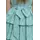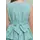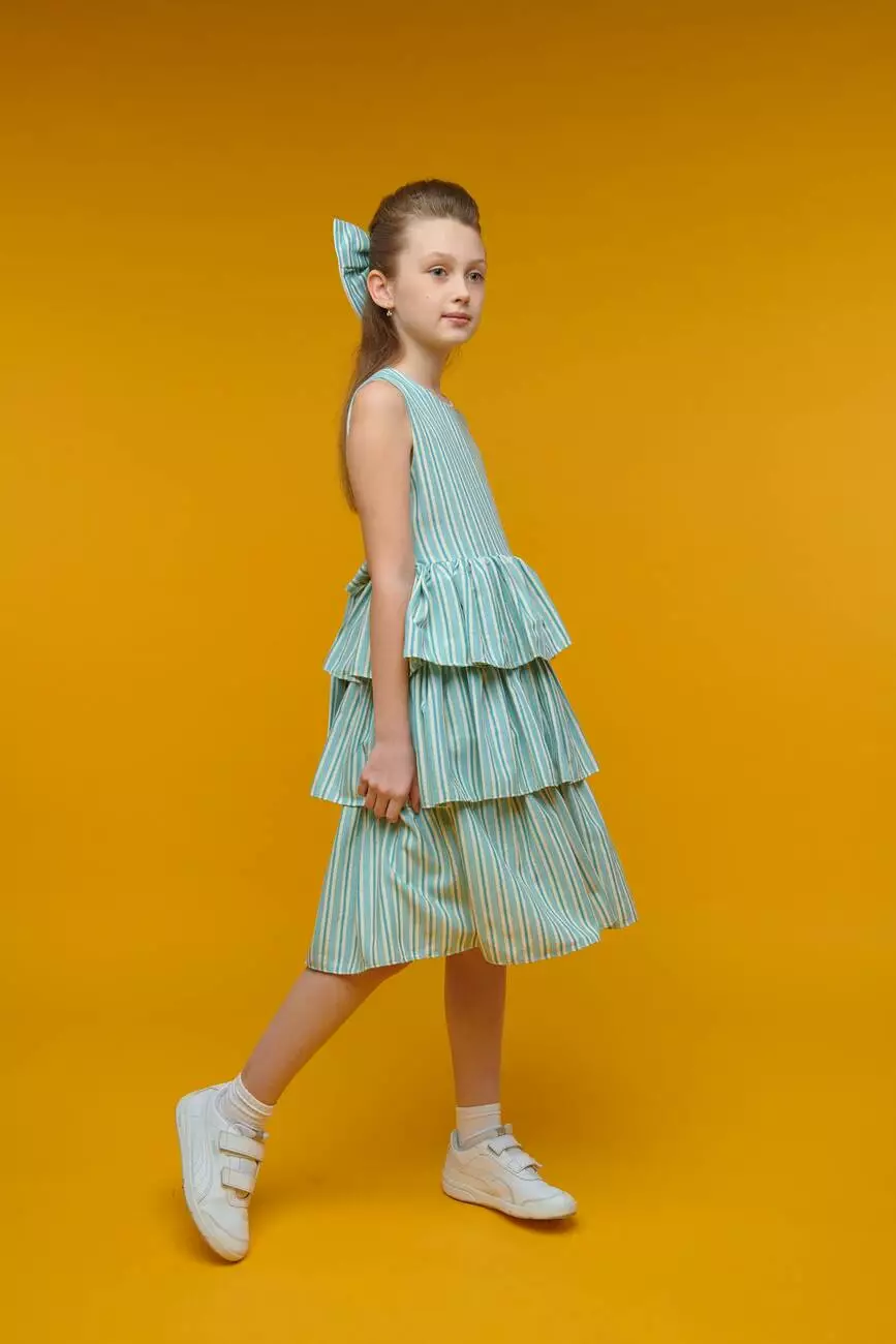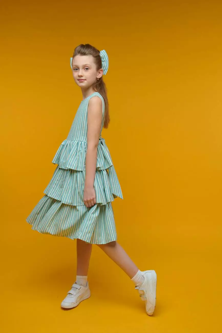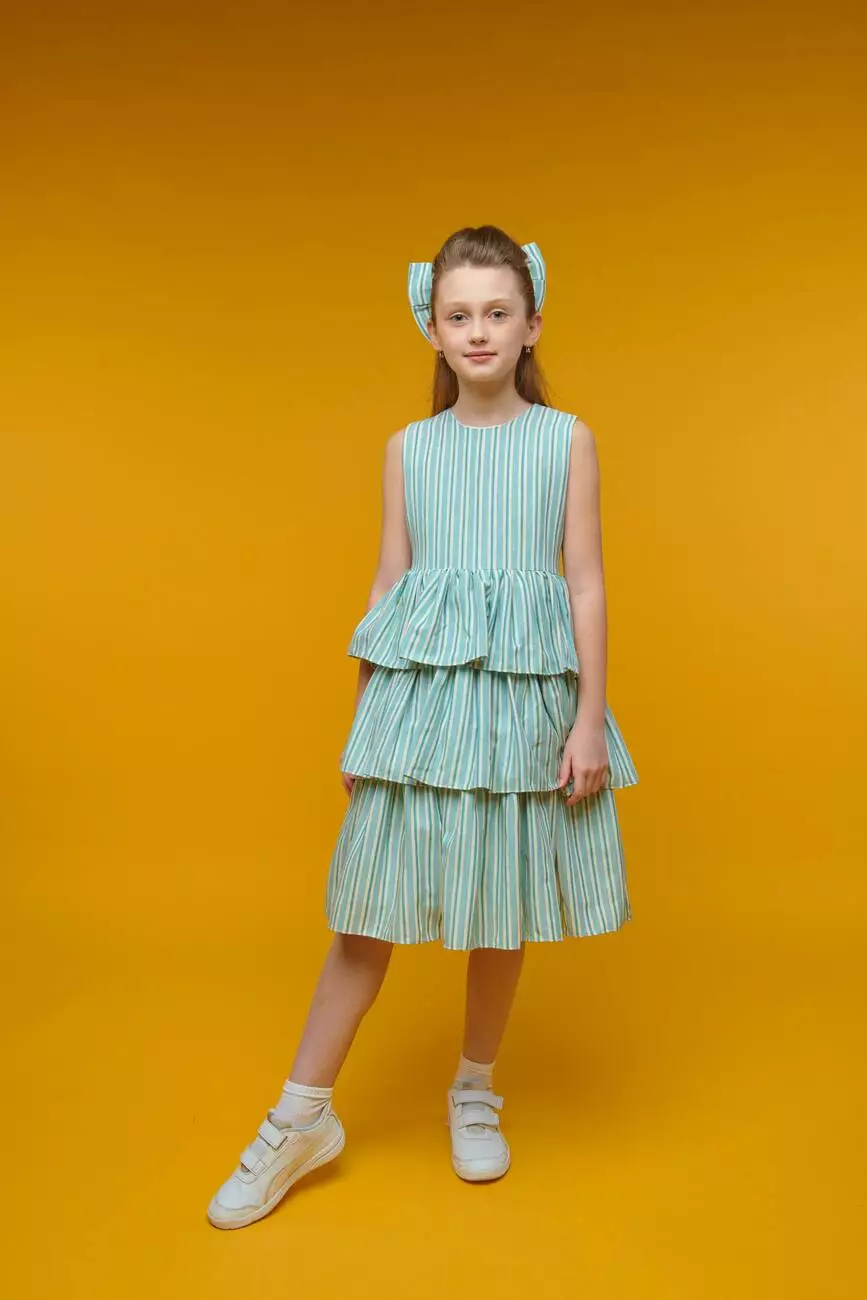 Деталі: основний колір сукні м'ятний із білими лаконічними смугами. Сукня без рукавів, кругла горловина. Застібається на блискавку, на спинці. Фасон – приталений. На поясі стрічка, яка зав'язується позаду великим бантом. Довжина сукні – до колін. Спідниця складається з трьох великих рюшів. У комплекті гарний аксесуар для волосся у колір сукні.