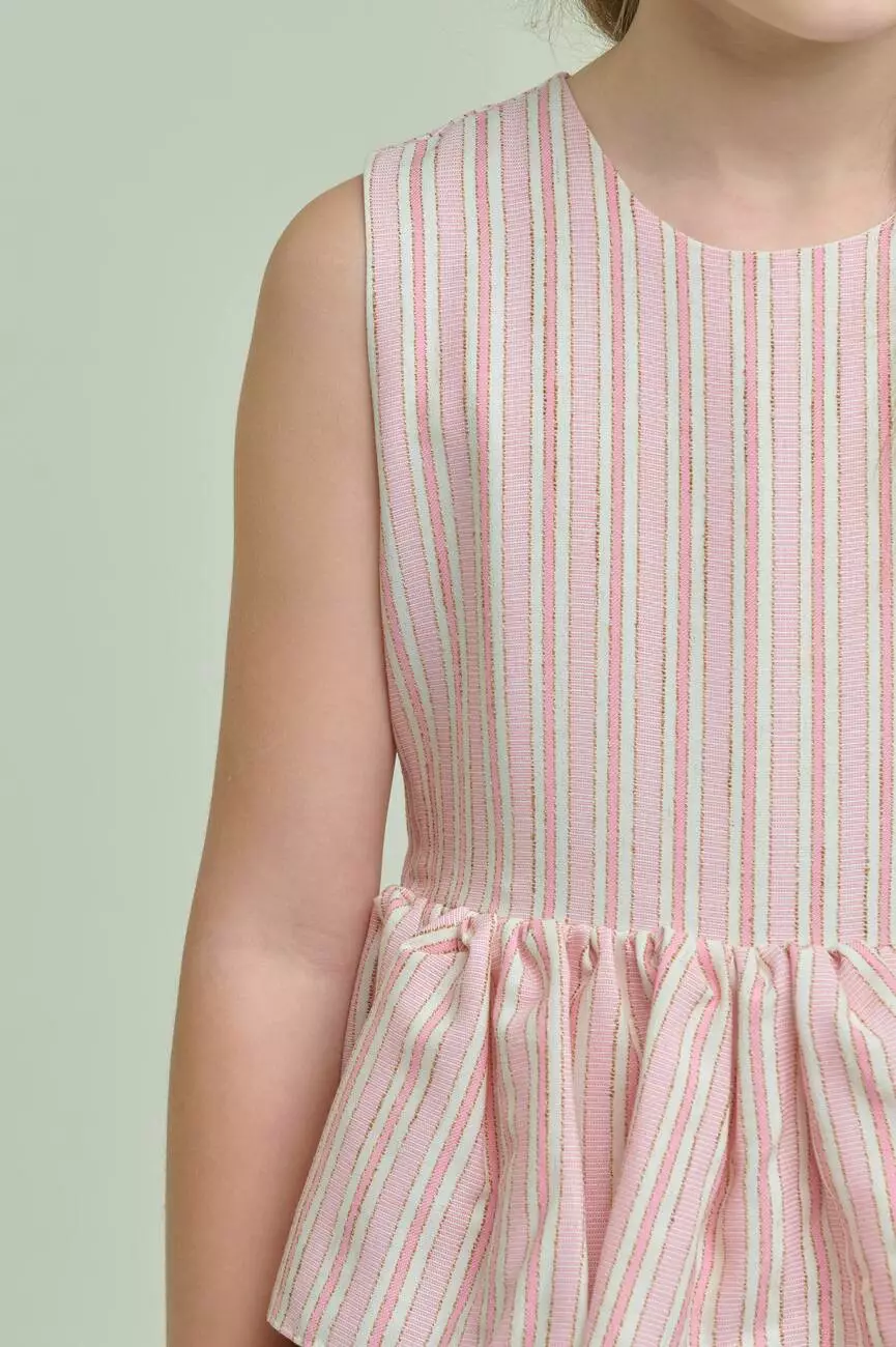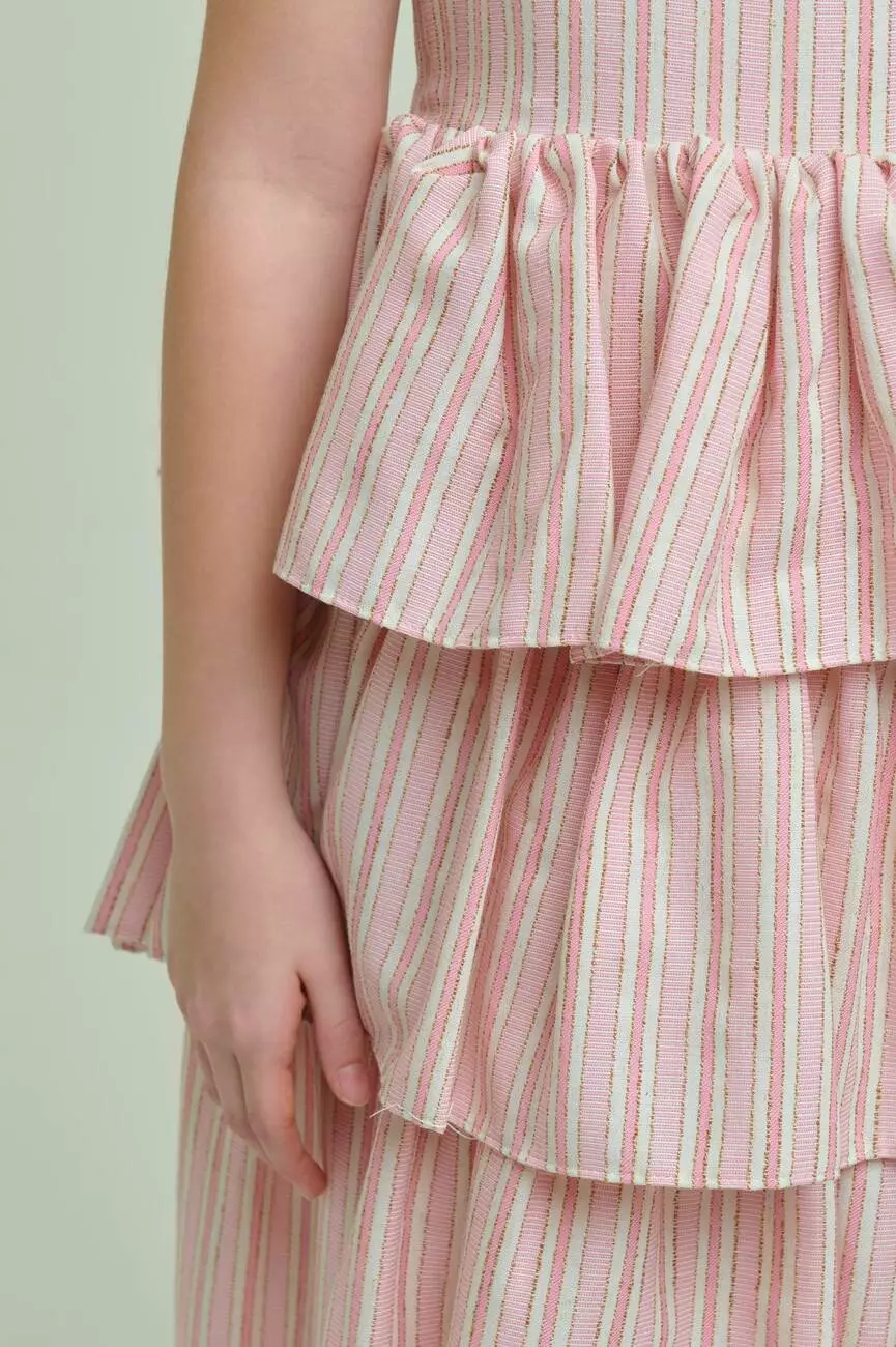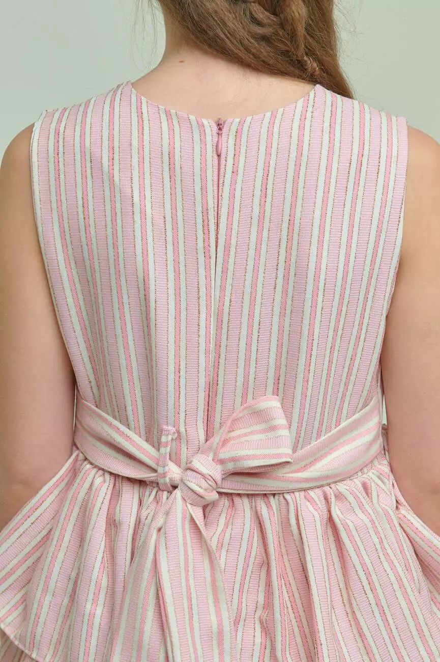 Деталі: основний колір сукні рожевий із білими лаконічними смугами. Сукня без рукавів, кругла горловина. Застібається на блискавку, на спинці. Фасон – приталений. На поясі стрічка, яка зав'язується позаду великим бантом. Довжина сукні – до колін. Спідниця складається з трьох великих рюшів. У комплекті гарний аксесуар для волосся у колір сукні.