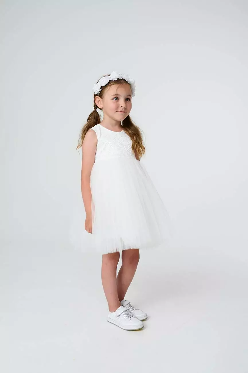 Деталі моделі: Сукня молочного кольору. Ліф сукні виконаний із якісного гіпюру, Підкладка бавовняна. Кругла горловина. Без рукавів. Застібка – блискавка на спинці. Спідниця пишна виконана із трьох шарів фатину. Четвертий, нижній шар спідниці із атласу. Добре тримає форму. Довжина сукні – по коліно.