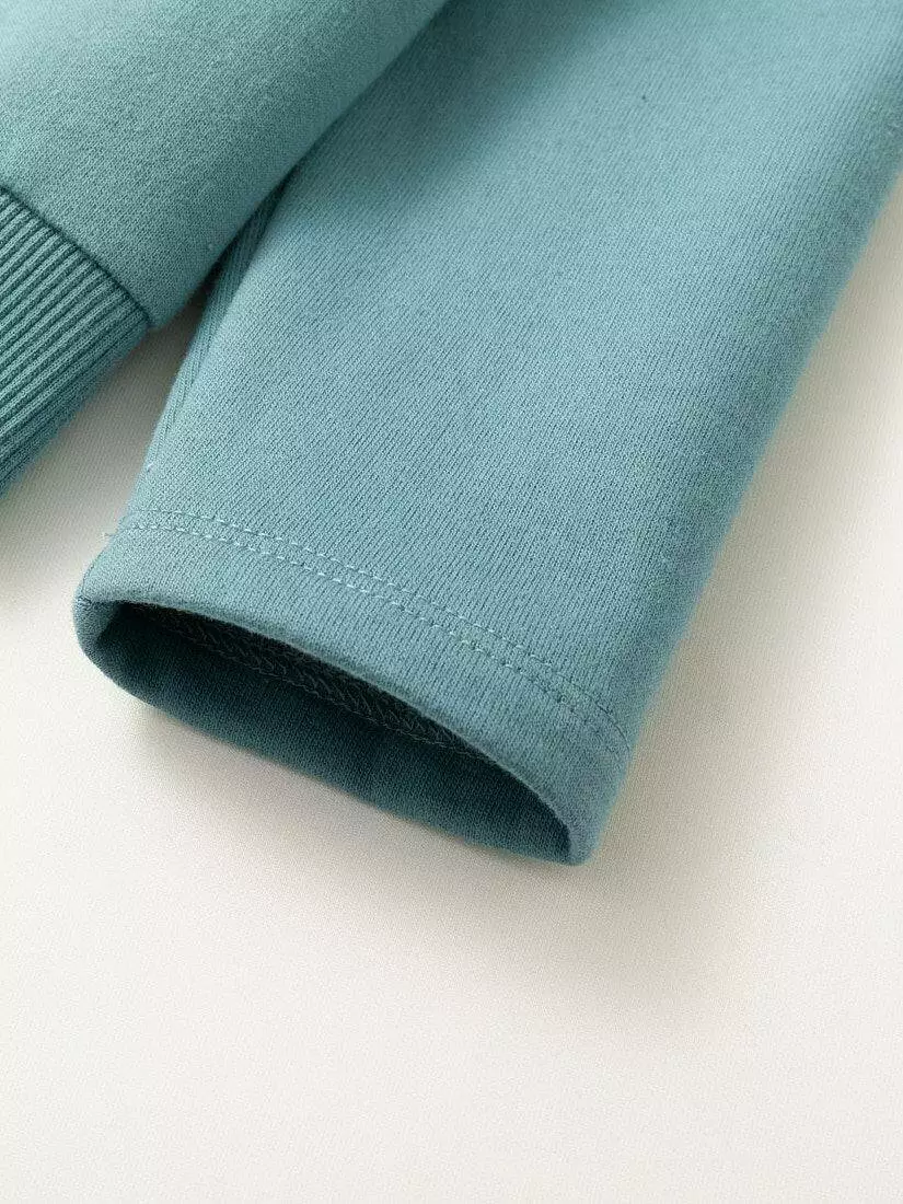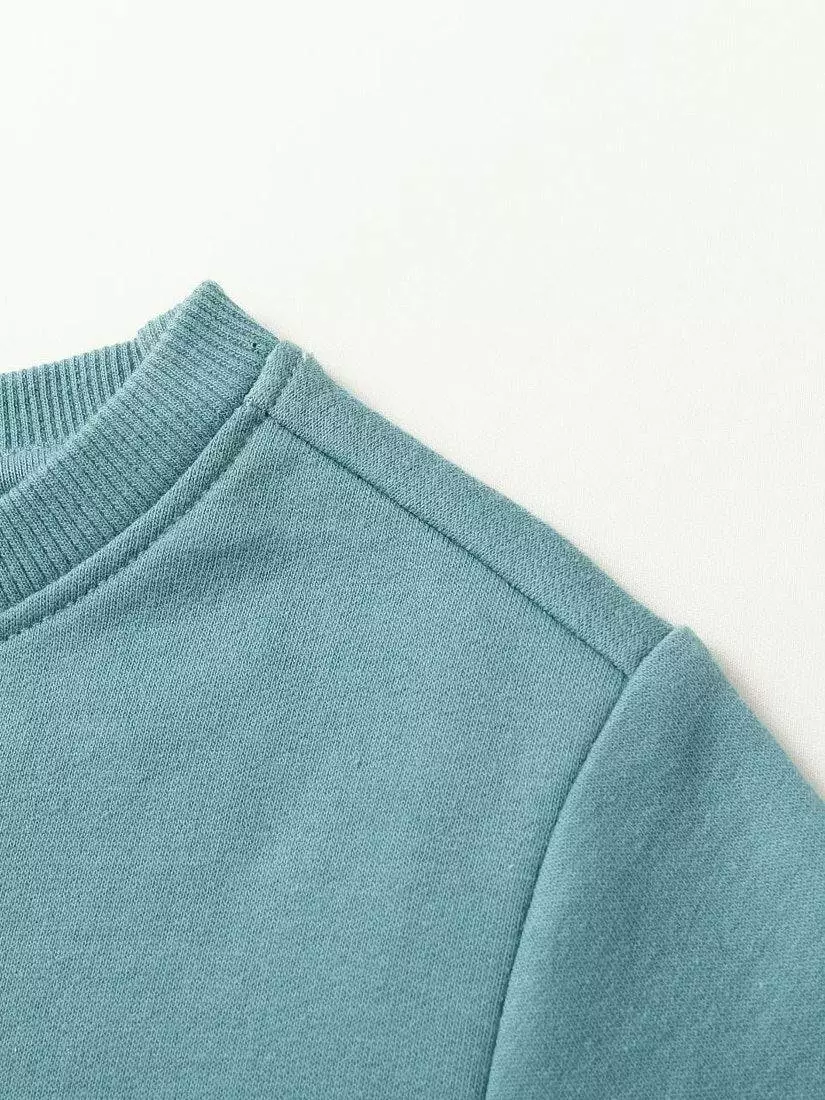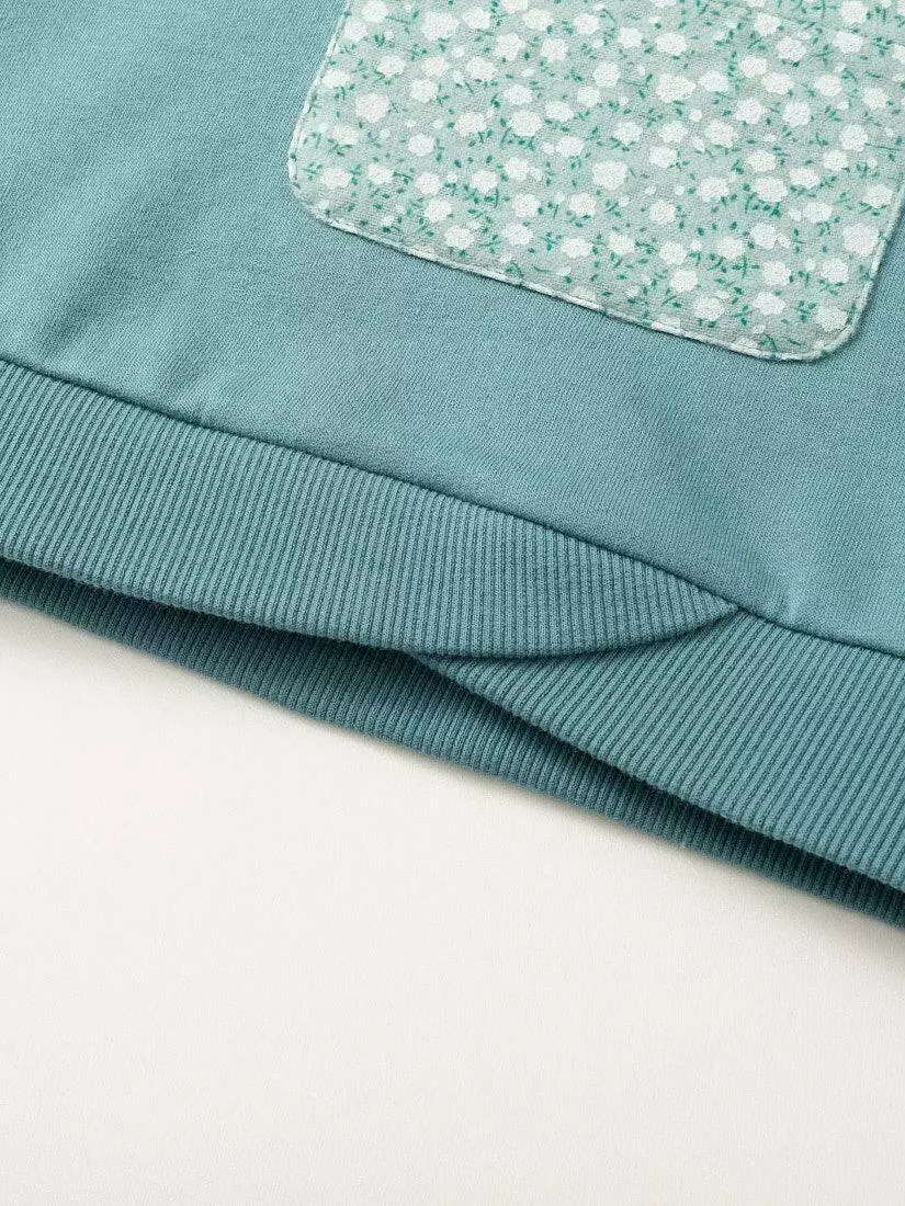 Деталі моделі: світшот світло-зеленого кольору. Кругла горловина. Довгий рукав. На грудях аплікація з квіткового принта та накладної кишені. Горловина та низ світшота оброблені еластичною резинкою. Світшот теплий, із начосом.