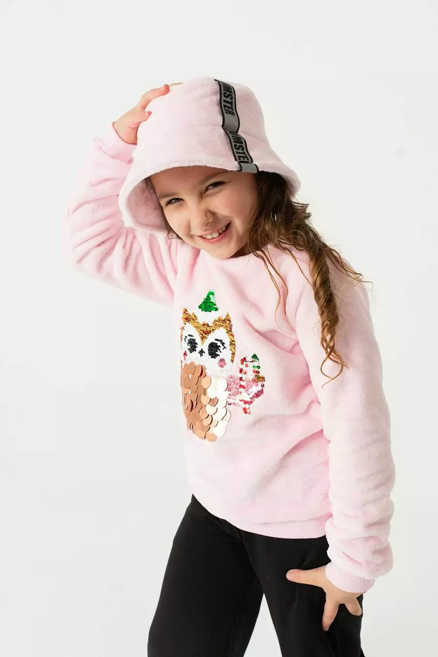 Деталі моделі: Світшот світло-рожевого кольору. Кругла горловина. Манжети на рукавах та по низу із якісної рибани. На грудях декоративна аплікація з двосторонніх паєток у вигляді Совы. Без кишень. Тканина - махра.