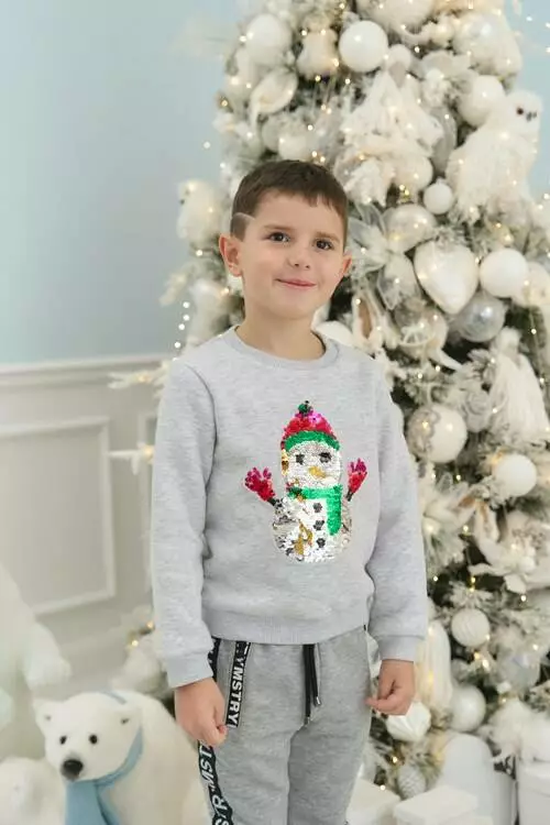 Деталі моделі: Світшот світло-сірого кольору. Кругла горловина. Манжети на рукавах та по низу із якісної рибани. На грудях декоративна аплікація з двосторонніх паєток у вигляді Сніговика. Без кишень. Тканина - тринитка на флісі.
