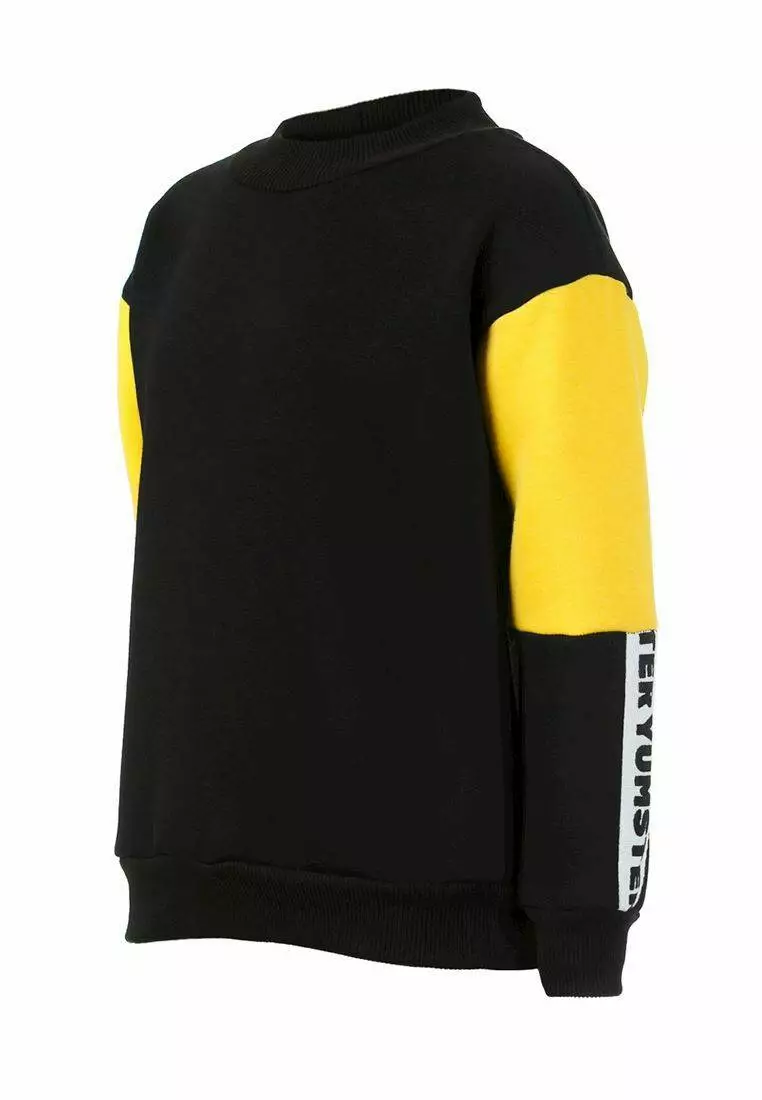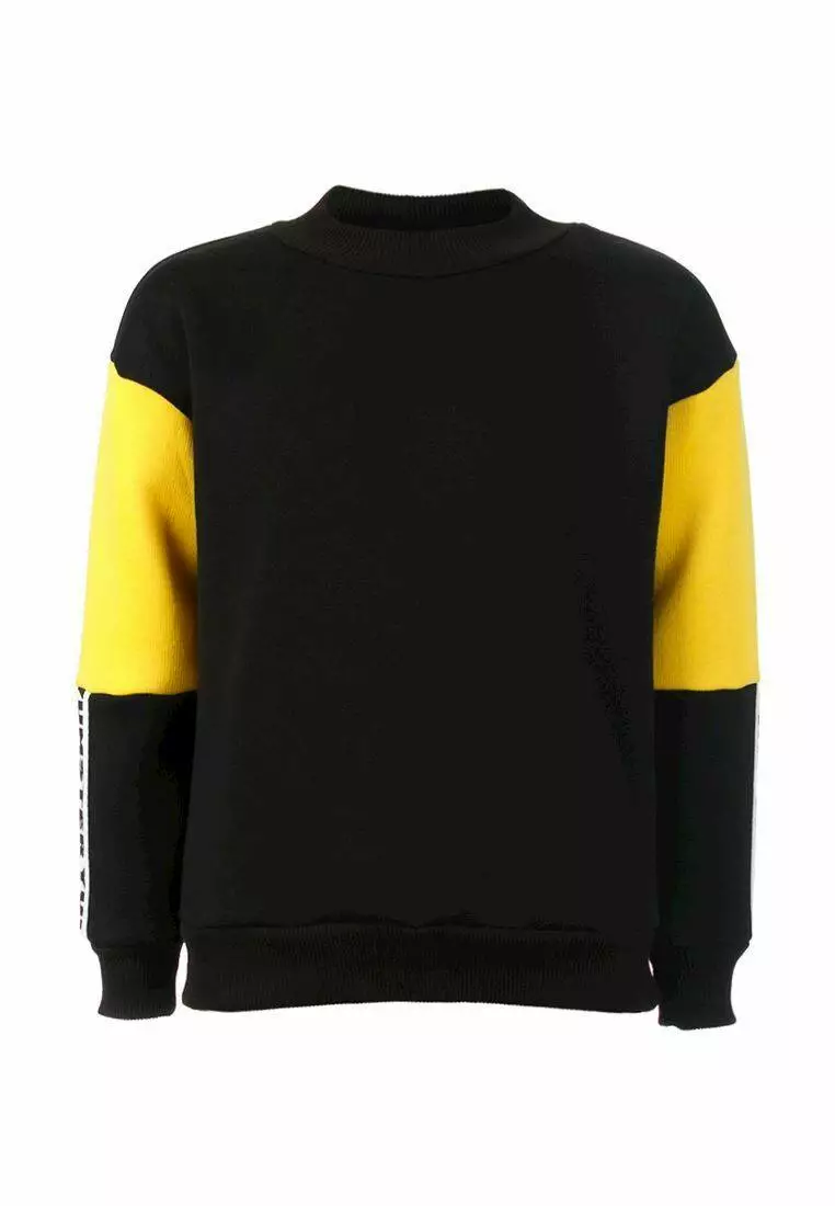Деталі: Світшот чорного кольору. Жовті вставки на рукавах. Біла тасьма з фірмовим принтом. Манжети з резинками на рукавах і подолі.