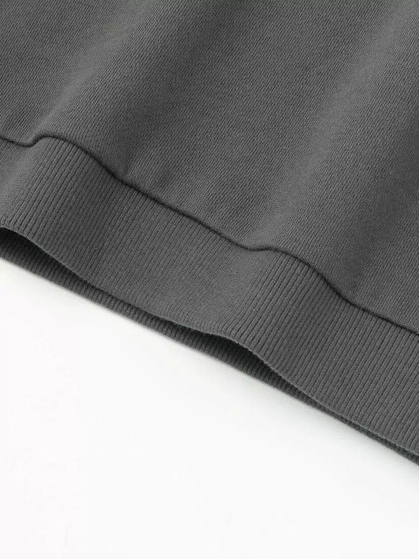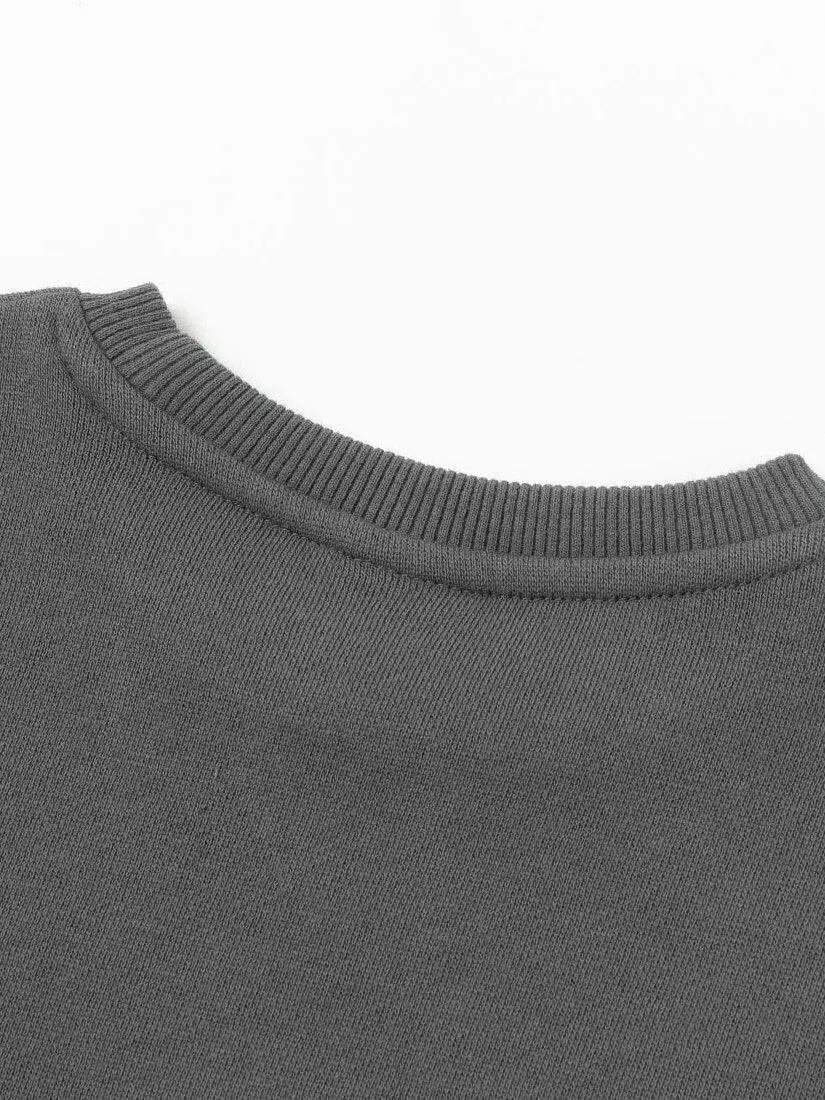 Деталі моделі: світшот сірого кольору. Кругла горловина. Довгий рукав. На грудях принт у вигляді напису. Горловина, манжети на рукавах та низ світшота обрамлені еластичною резинкою. Світшот із начосом.