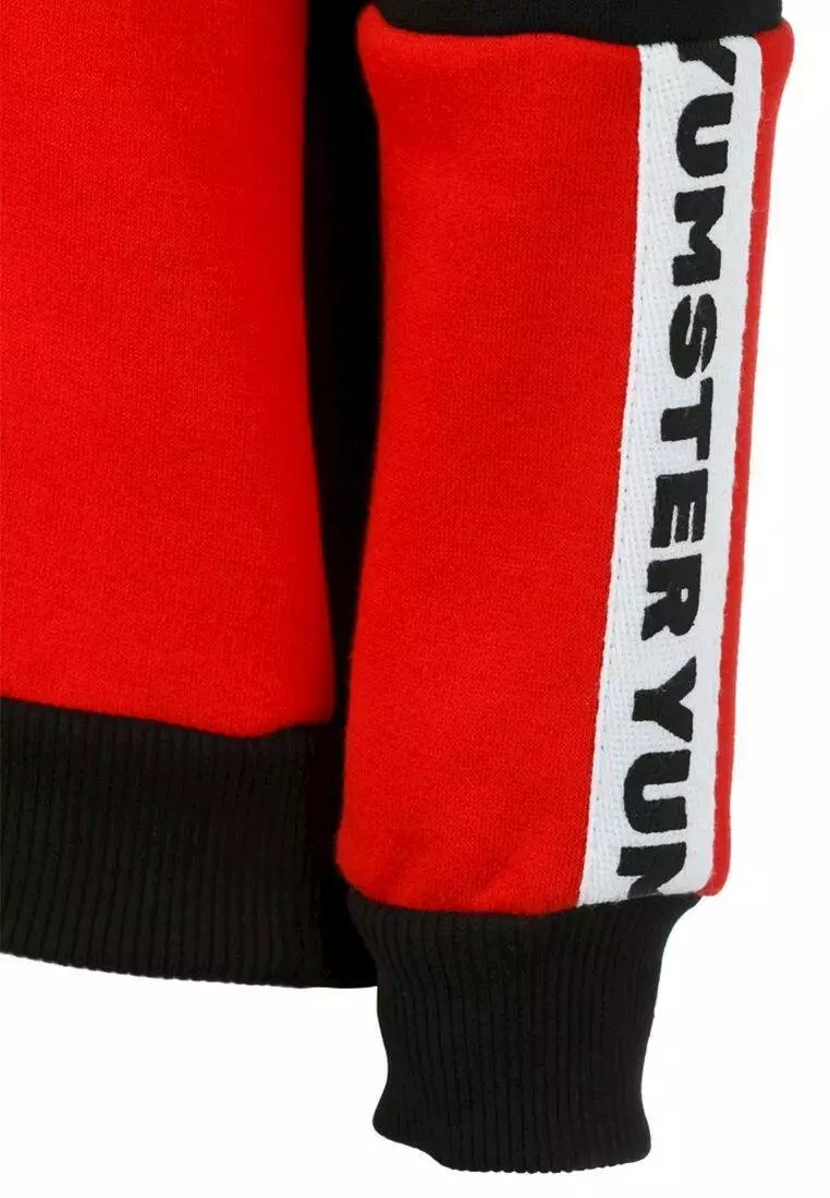 Деталі моделі: Основний колір світшота – червоний з чорним. Кругла горловина. Довгий рукав. Манжети на рукавах, горловина та низ виробу обрамлені якісною рибаною. Декор – брендована тасьма на рукаві. Матеріал - тринитка.
