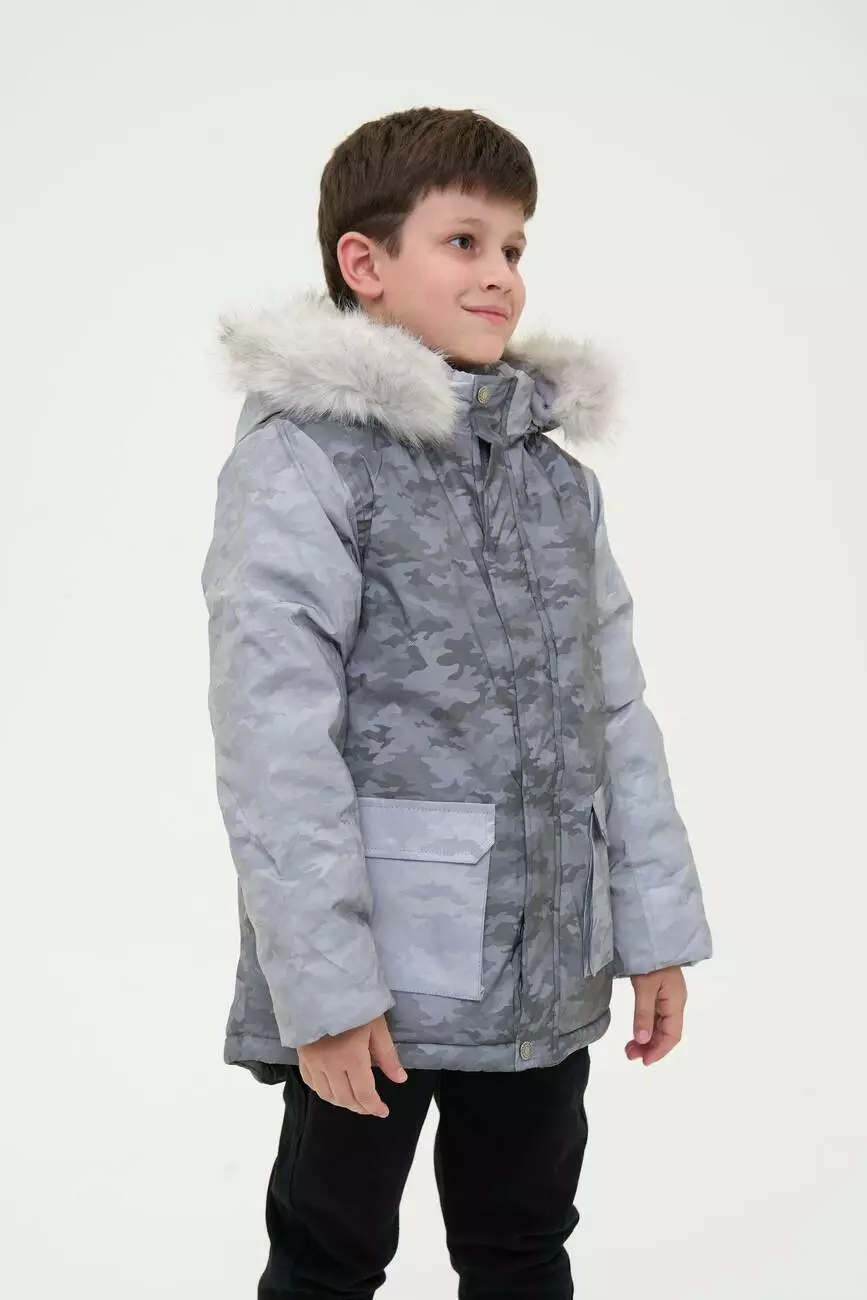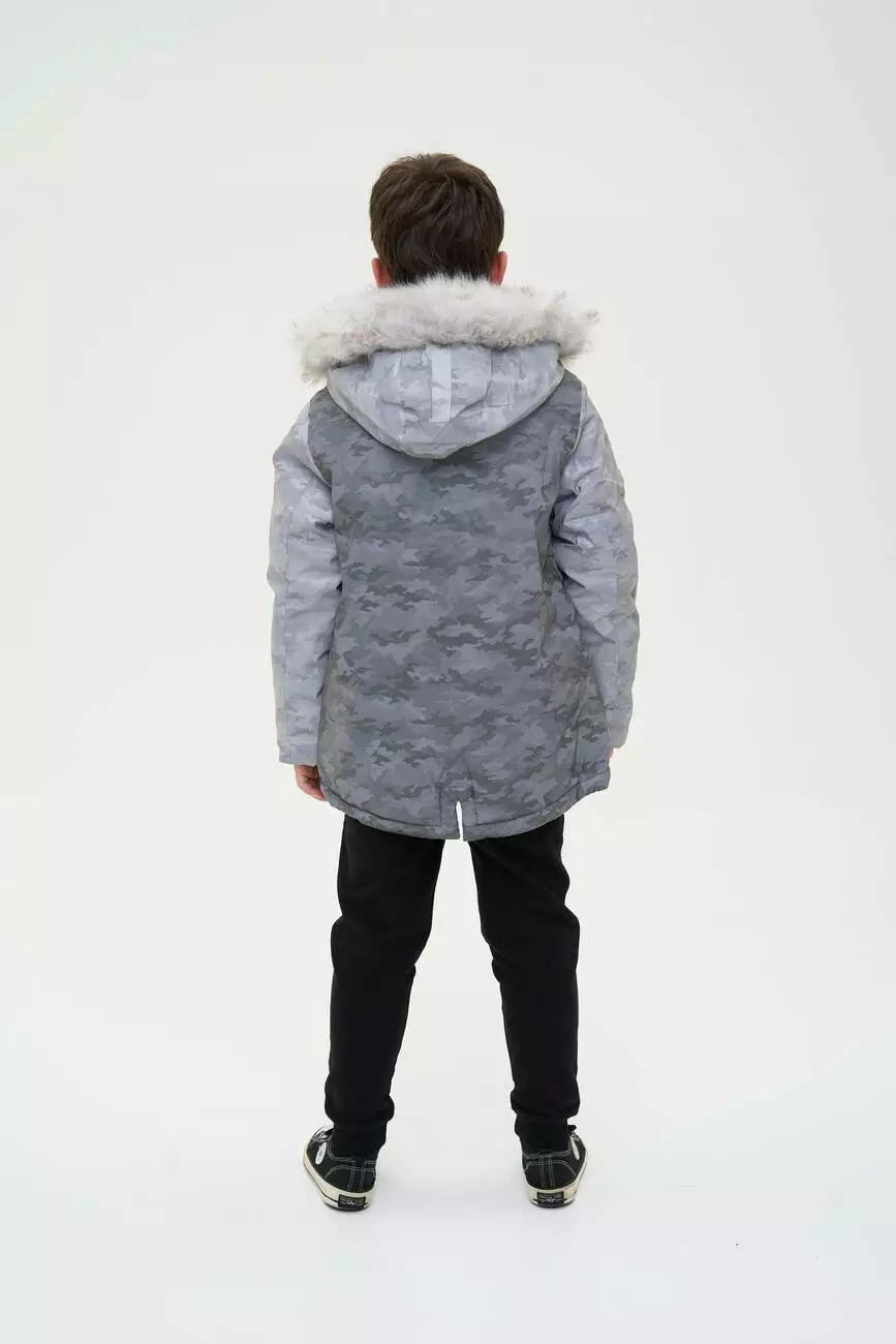 Деталі моделі: водонепроникна куртка сірого кольору. Глибокий капюшон із хутром. Капюшон відстібний, на блискавці. Комірець стійка. Застібка на блискавці та кнопки. Накладні кишені. Довжина куртки - нижче за пояс. Прямий крій. Камуфляжний принт. Матеріал верху – мікрофібра.