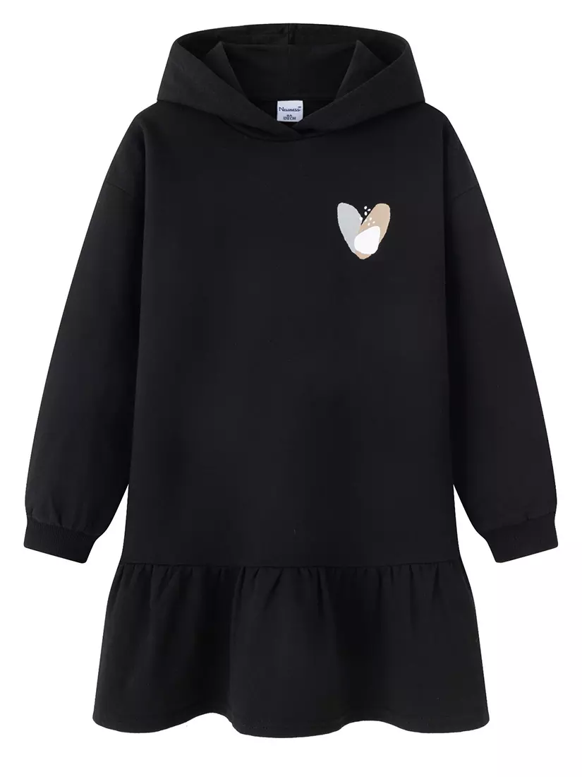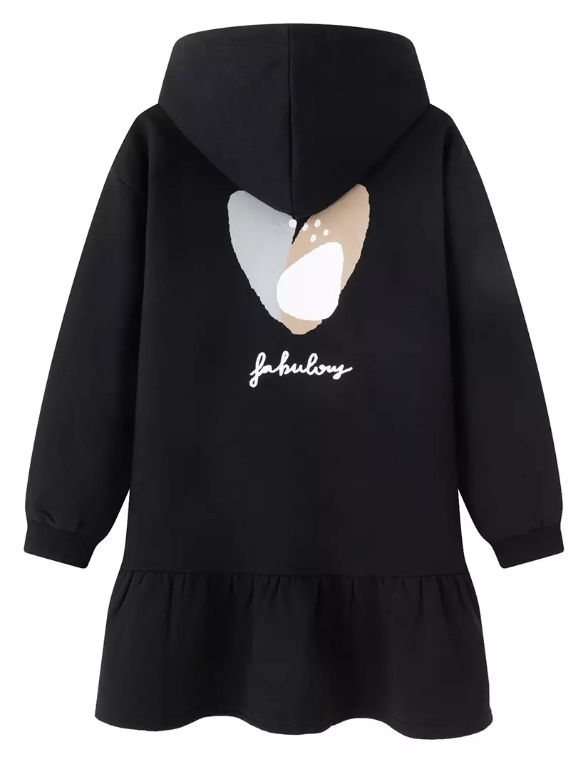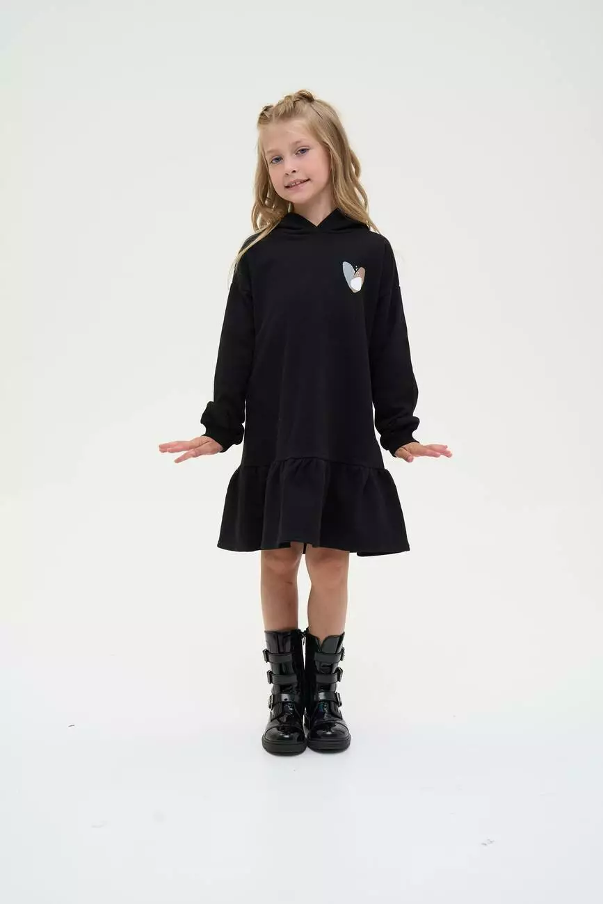 Зустрічайте нову колекцію - колаборація брендів YUMSTER і NEWNESS! Сукня чорна з довгим рукавом та капюшоном - чудовий елемент базового гардеробу. Деталі моделі: сукня чорного кольору. Глибокий каптур. Довгий рукав із манжетами з еластичної резинки. Занижена лінія плеча. Спереду та ззаду є прин. Сукня прямого крою. Низька талія. Спідниця на збірці. Довжина – до колін. Тканина – джерсі, всередині з начосом. Розмірний ряд: на зріст від 128 см до 164 смСклад: 80% бавовна, 20% поліестер