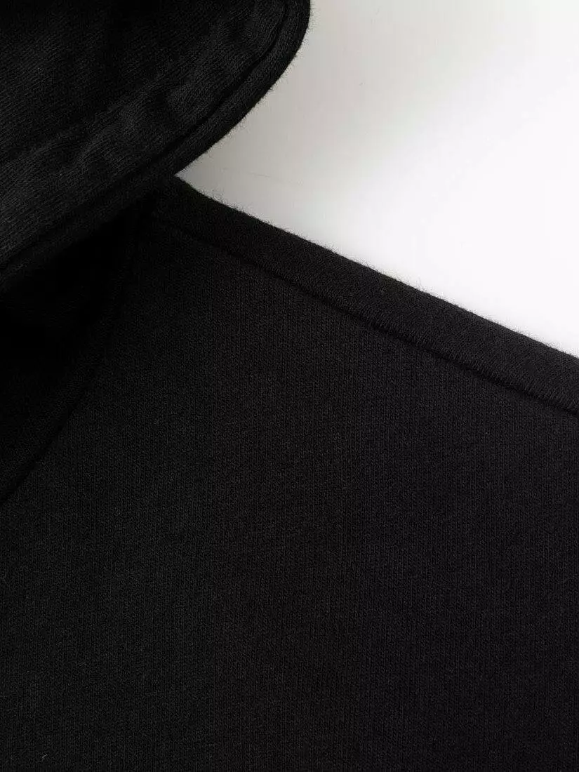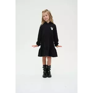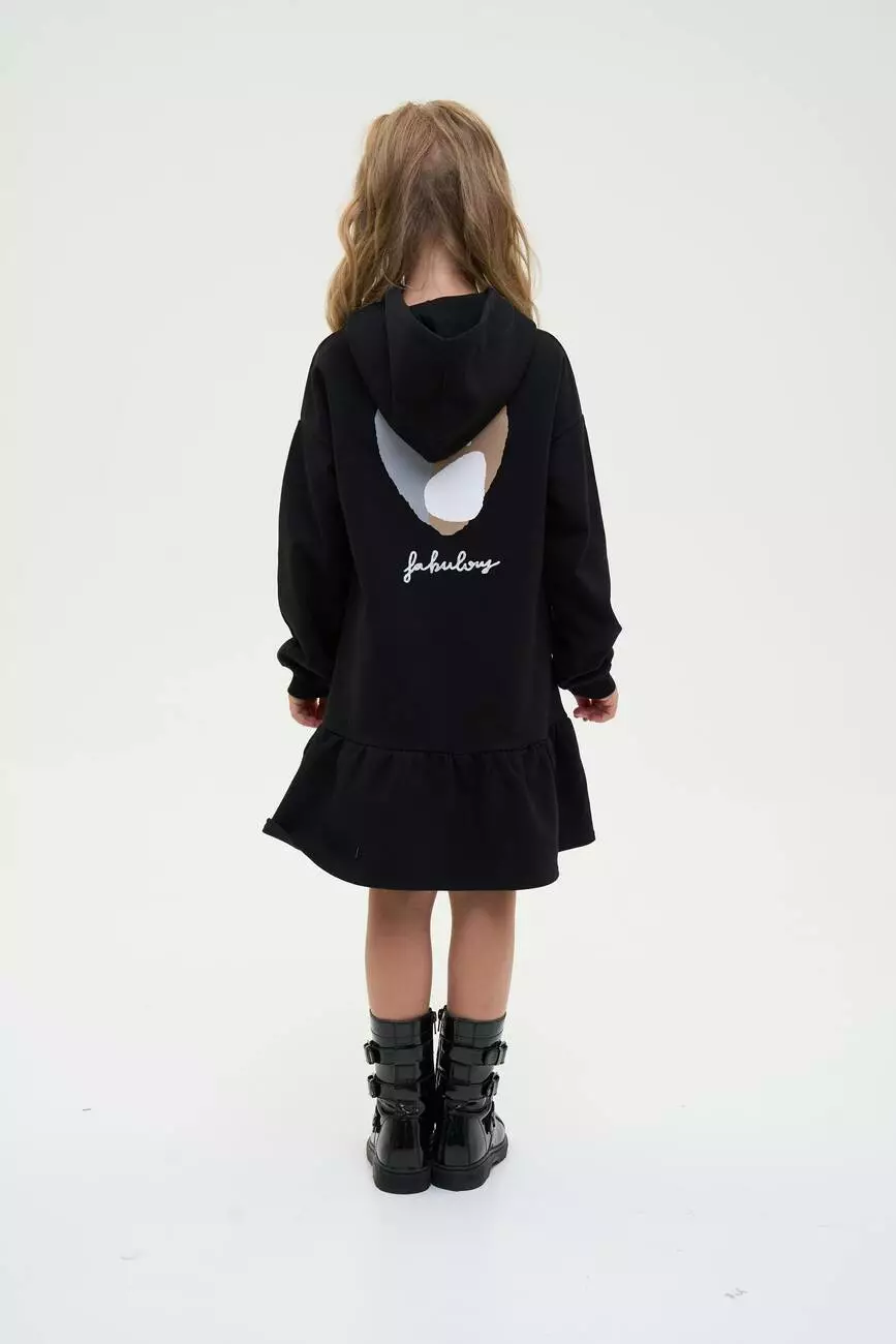 Деталі моделі: сукня чорного кольору. Глибокий каптур. Довгий рукав із манжетами з еластичної резинки. Занижена лінія плеча. Спереду та ззаду є прин. Сукня прямого крою. Низька талія. Спідниця на збірці. Довжина – до колін. Тканина – джерсі, всередині з начосом.