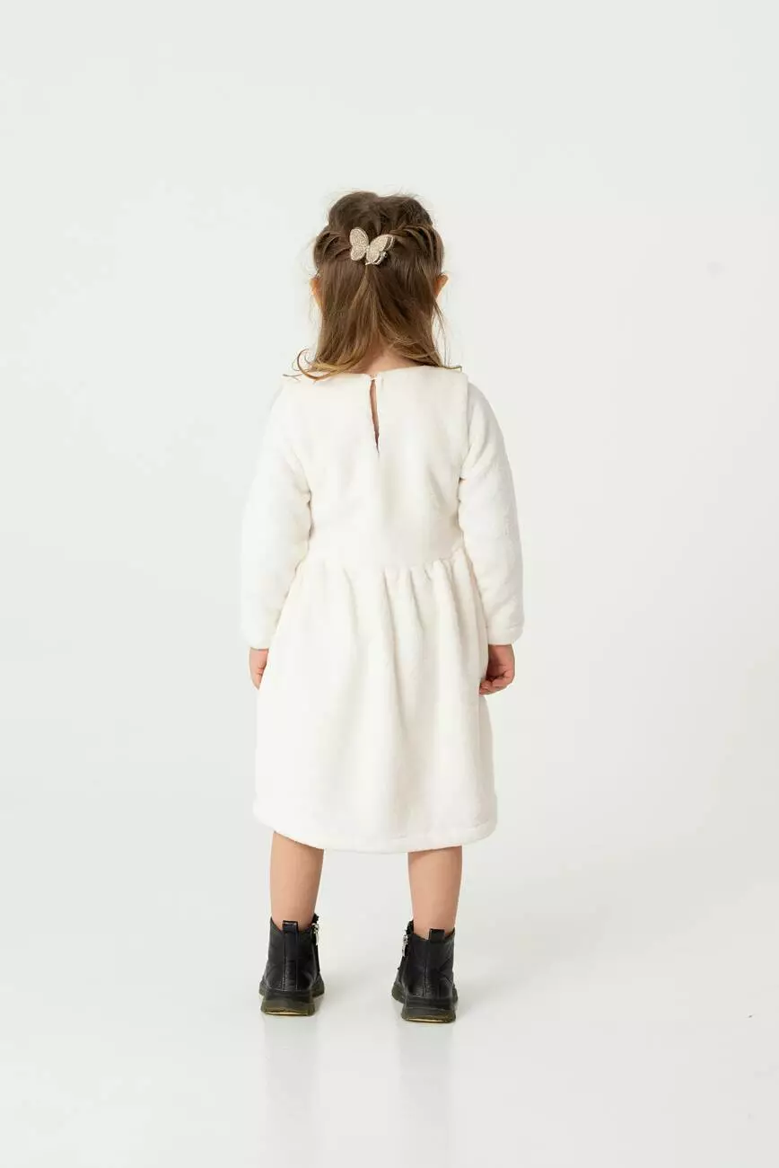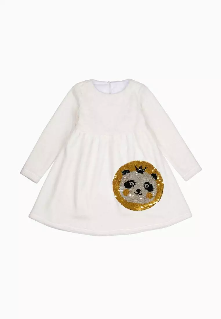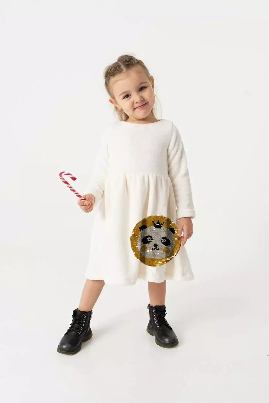 Деталі моделі: Колір сукні – білий. Сукня з довгим рукавом, на підкладці, відрізна по лінії талії. Горловина – круглий виріз, під шийку. Застібка - ззаду на гудзик (крапелька). Рукав - прямий, трохи звужений до низу. Спідниця зібрана по лінії талії. З лівого боку спідниці аплікація з двосторонніх паєток у вигляді панди. Матеріал – махра. Підкладка – бавовна.