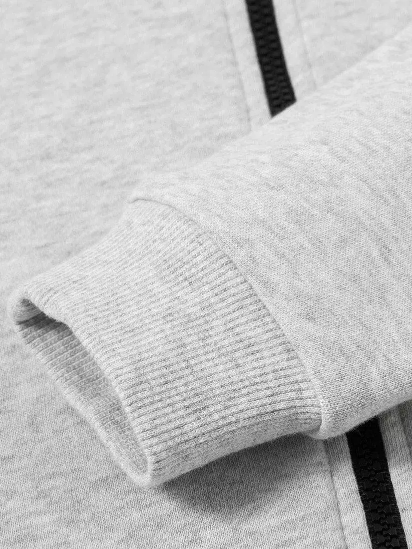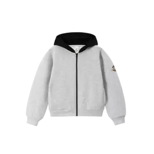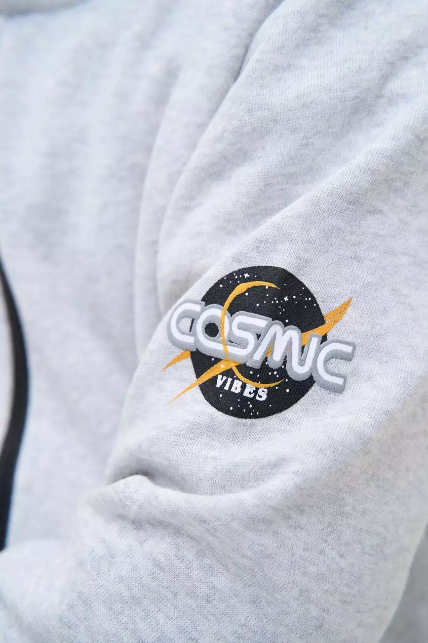 Деталі моделі: толстовка світло-сірого кольору. Глибокий каптур чорного кольору. Спереду застібка-блискавка. На рукаві декоративний елемент - нашивка. Дві бокові кишені. Манжеті та низ толстовки виконані з еластичної гумки, яка служить чудовою фіксацією та забезпечує комфорт у русі.