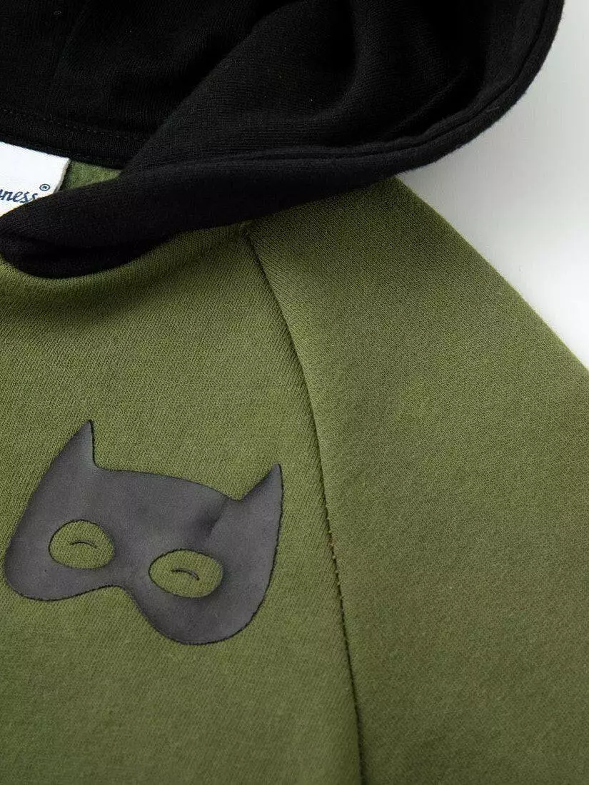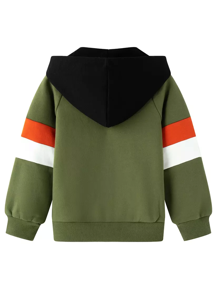 Деталі моделі: Толстовка зеленого кольору. Глибокий чорний капюшон. Спереду застібка – блискавка. Кишеня-кенгуру. Довгий рукав без плечового стежка. На рукавах вставки контрастного кольору. Манжети на рукавах та низ толстовки виконані з еластичної резинки. Толстовка тепла, всередині з начосом.