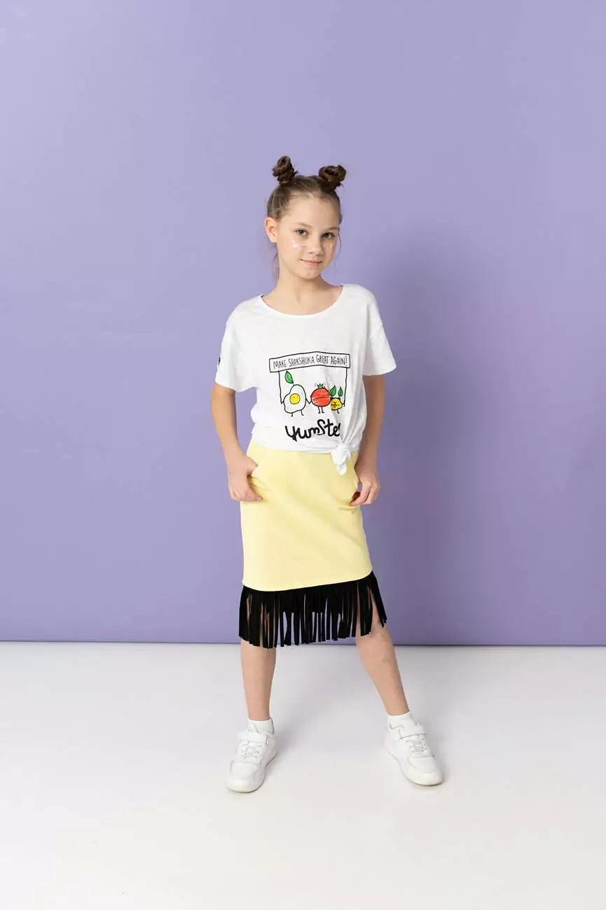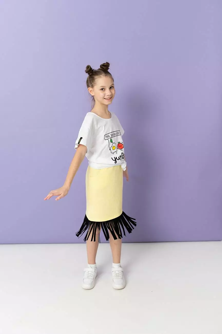 Трикотажна жовта спідниця з бахромою. Для дівчаток від 5 до 15 років.